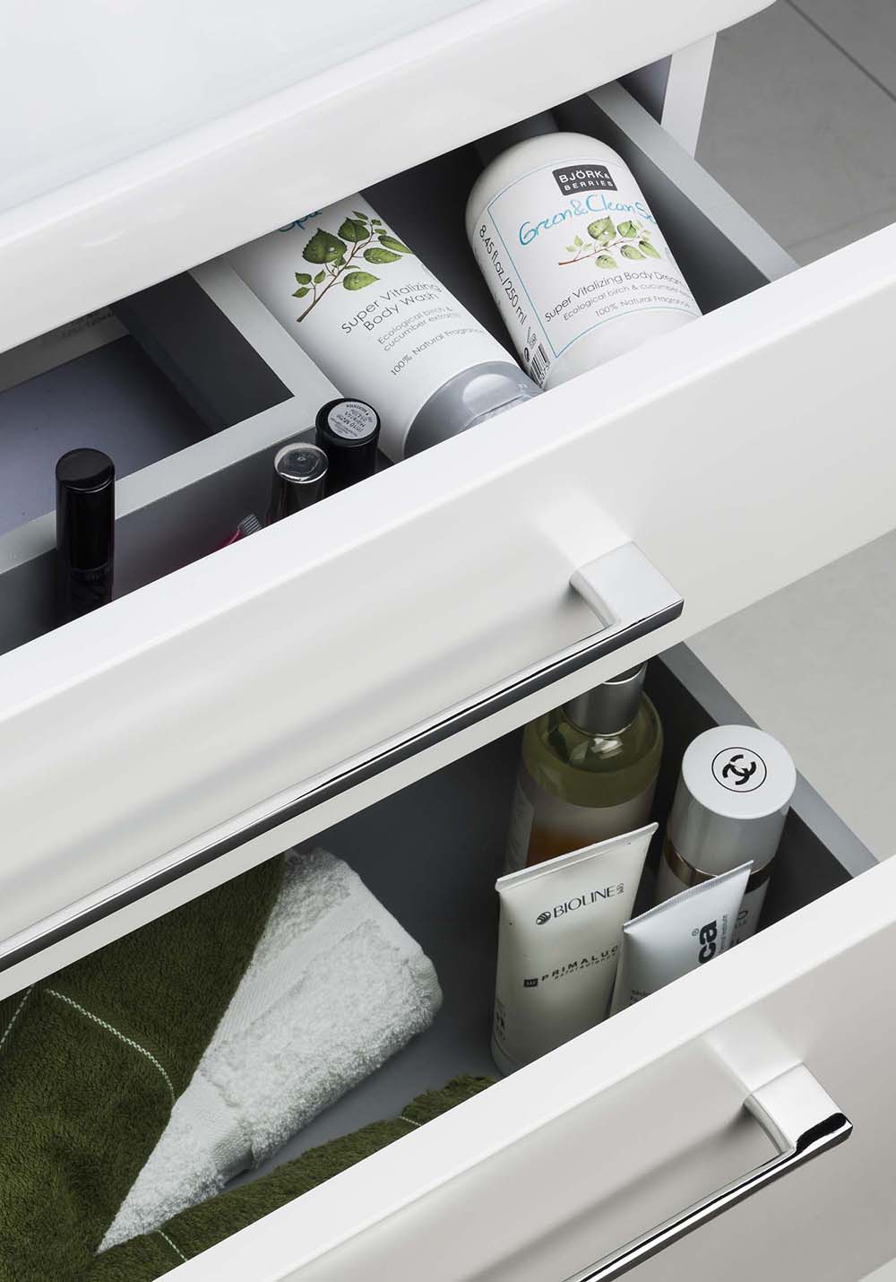 - Servant i porselen med overløp. Utstyrt med dempende skuffeskinner