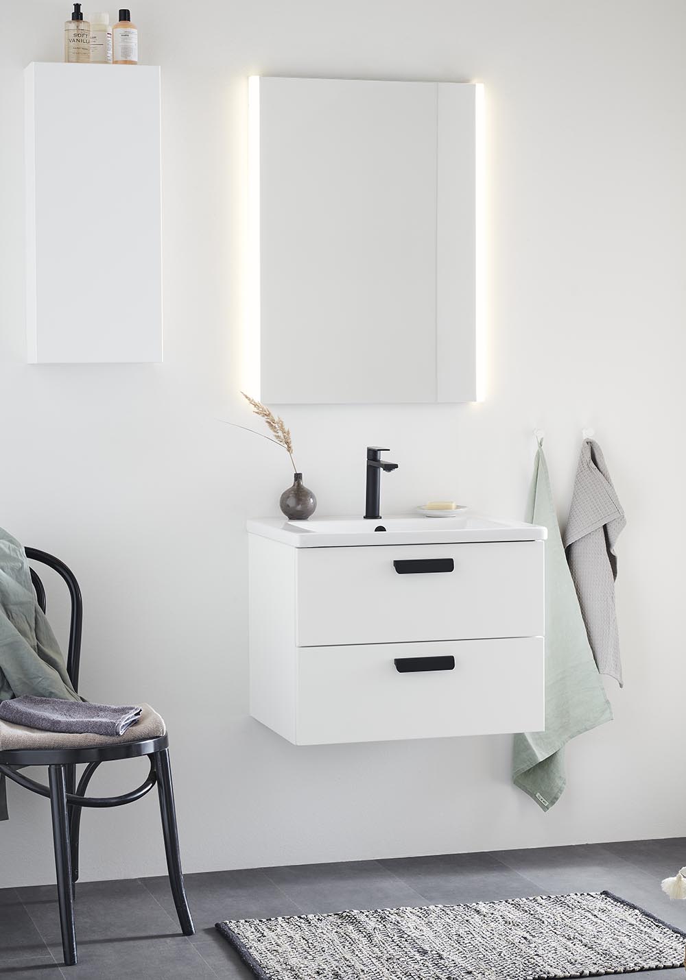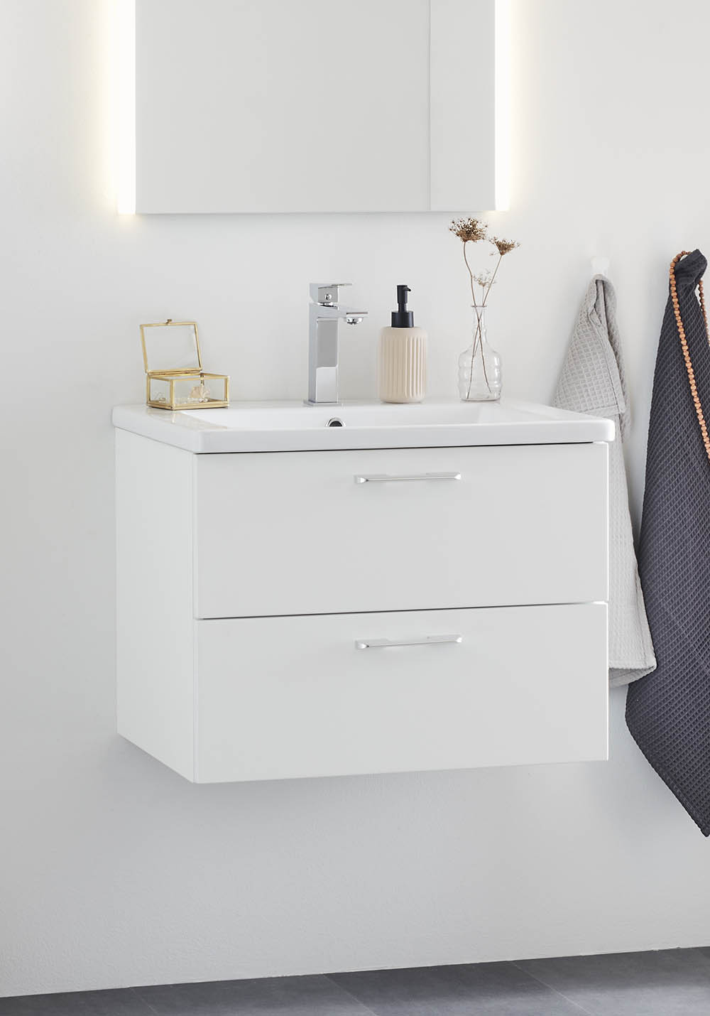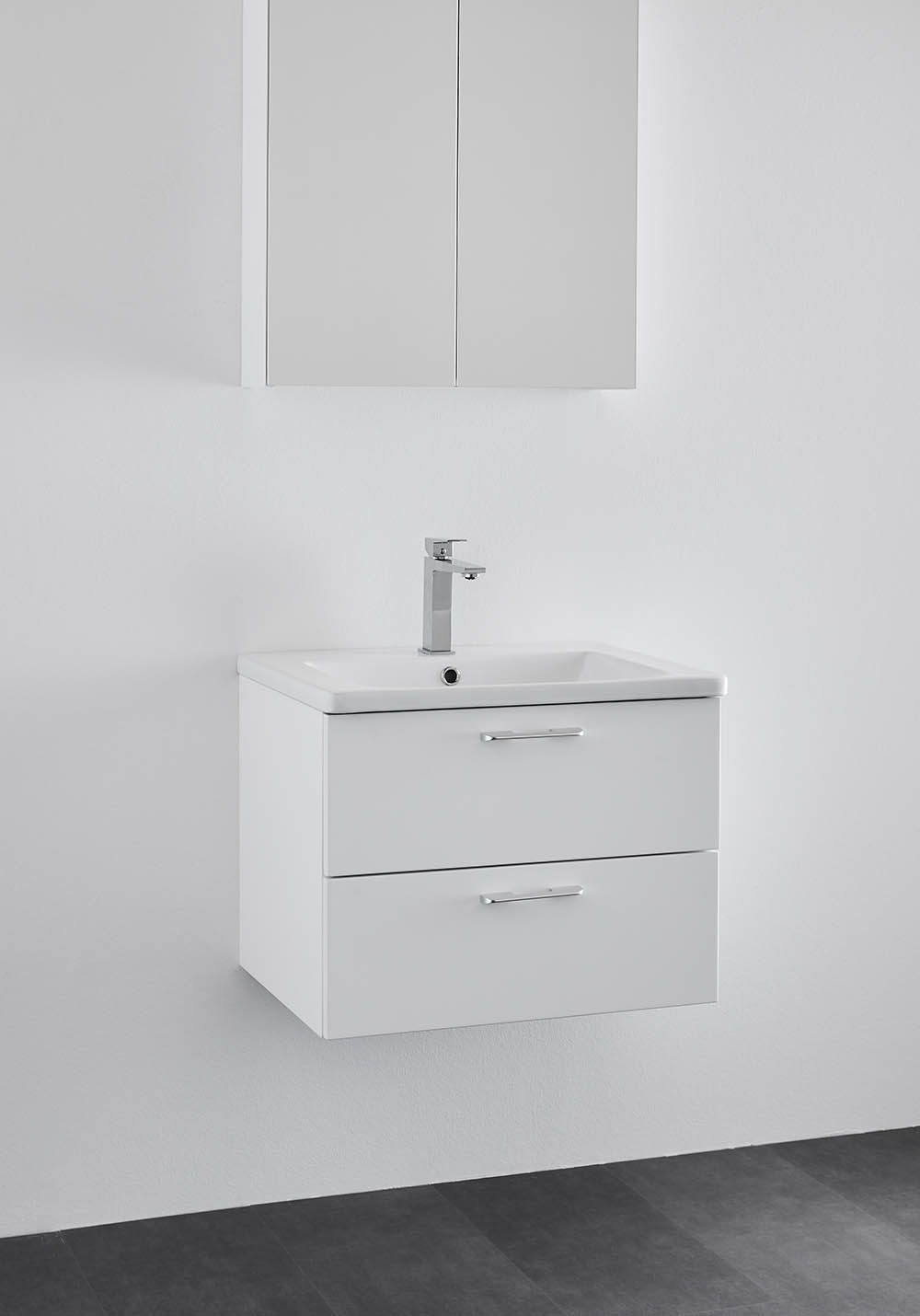 Neo baderomsmøbel med funksjoner som en moderne kommode forventes å ha. Perfekt for mindre baderom. Møbelet fås i klassisk hvit matt, i størrelsene 600 og 800mm. og har to skuffer med fulluttrekk og Soft Close-funksjon. Skuffefrontene er glatte og forboret på innsiden for håndtak i størrelsen CC128 eller sentrert knopp. Du kjøper de håndtak som passer din stil best. Velg Neo nedsenket servant i porselen til ditt skap. Skuffesidene er tynne, slanke i mørkegrå. Med sine to matchende skuffeinnsatser i grått, gir det møbelet ekstra god oppbevaring, fra store håndkler til små baderomsartikler. Møbelet kommer ferdigmontert og monteres på vegg med justerbare oppphengsbeslag for enkel og rask montering. Forberedt for både gulv- og veggavløp.
