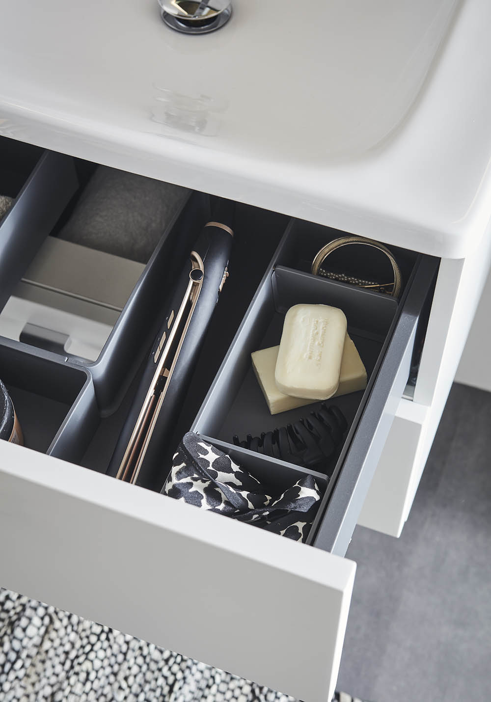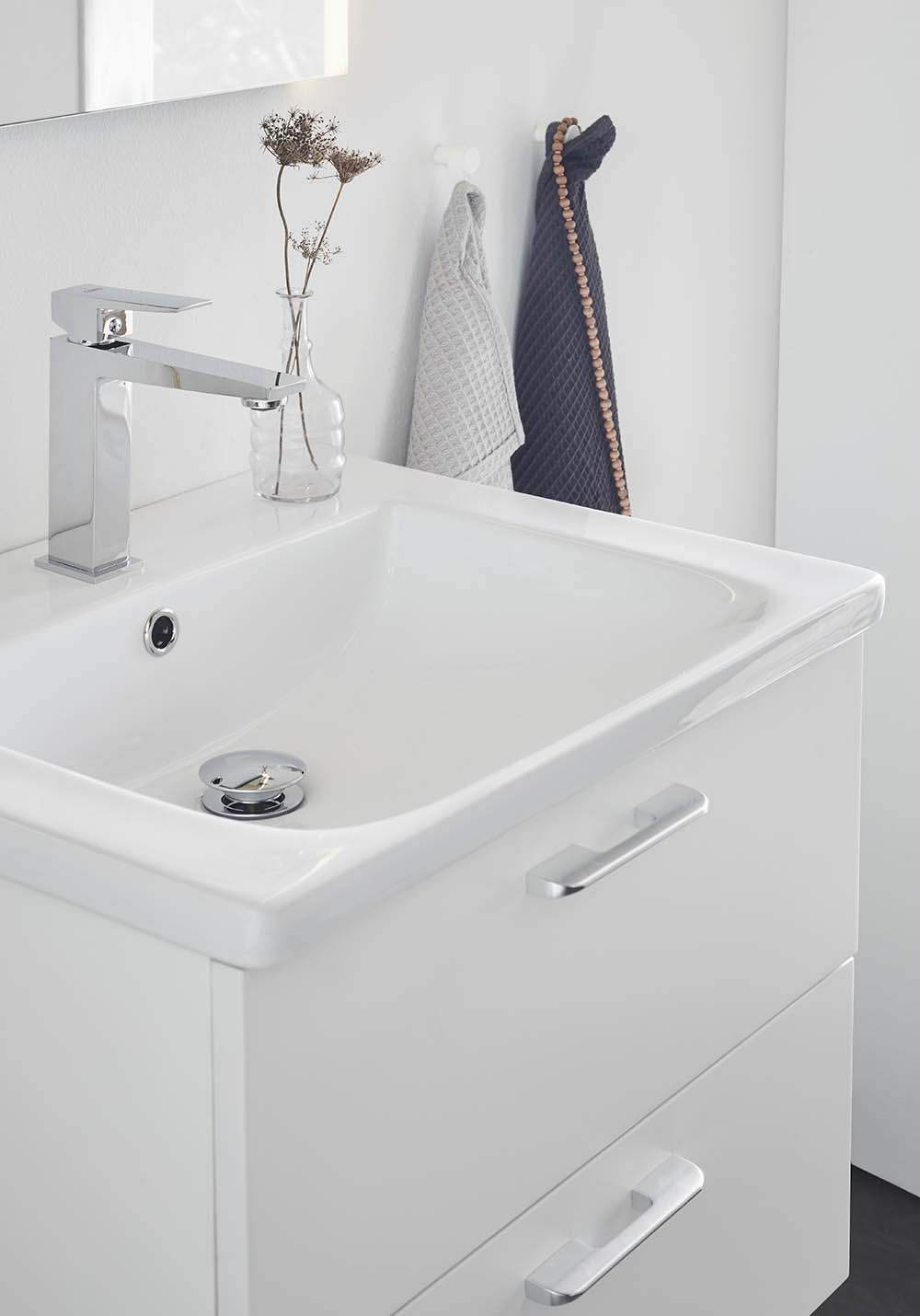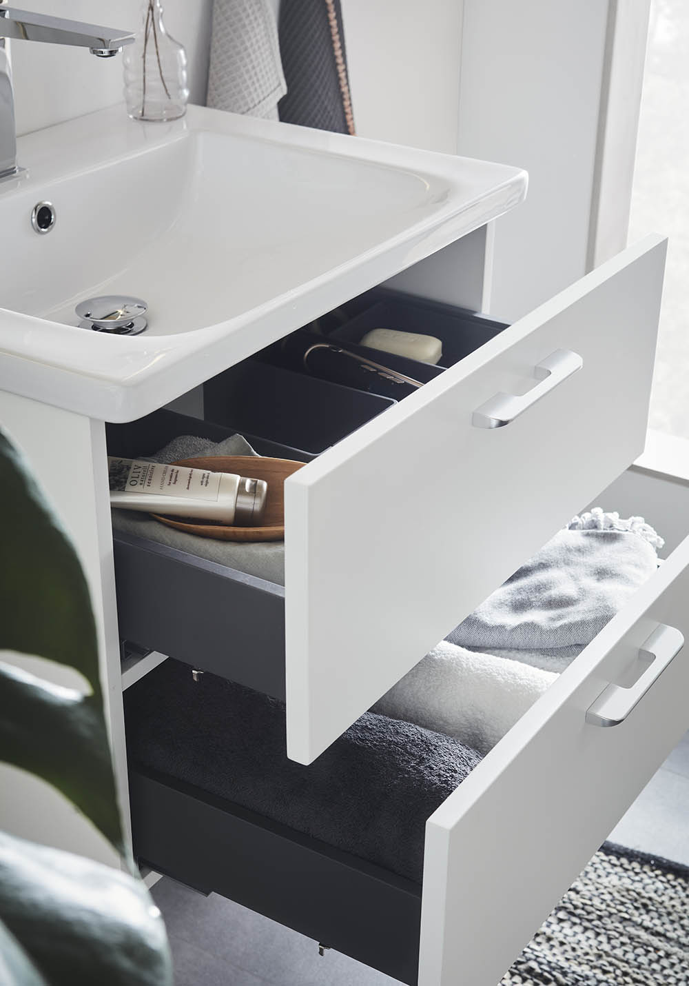 Neo baderomsmøbel med funksjoner som en moderne kommode forventes å ha. Perfekt for mindre baderom. Møbelet fås i klassisk hvit matt, i størrelsene 600 og 800mm. og har to skuffer med fulluttrekk og Soft Close-funksjon. Skuffefrontene er glatte og forboret på innsiden for håndtak i størrelsen CC128 eller sentrert knopp. Du kjøper de håndtak som passer din stil best. Velg Neo nedsenket servant i porselen til ditt skap. Skuffesidene er tynne, slanke i mørkegrå. Med sine to matchende skuffeinnsatser i grått, gir det møbelet ekstra god oppbevaring, fra store håndkler til små baderomsartikler. Møbelet kommer ferdigmontert og monteres på vegg med justerbare oppphengsbeslag for enkel og rask montering. Forberedt for både gulv- og veggavløp.