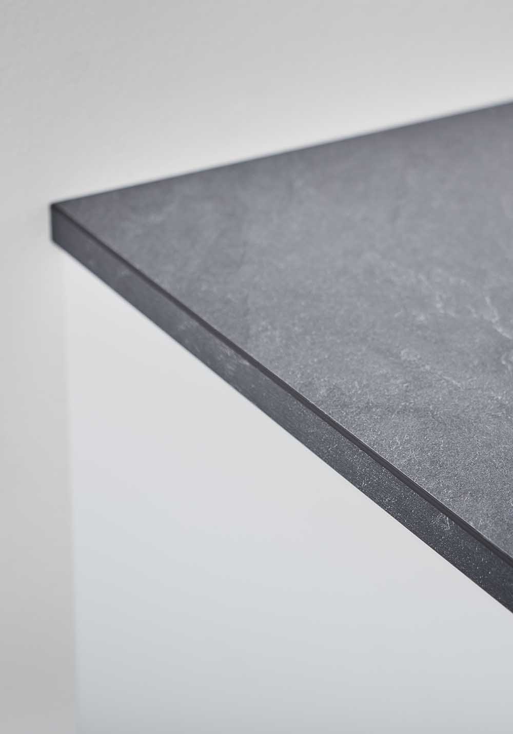 Skifermønstret benkeplate av melaminbelagt MDF. Hull gjøres av installatøren avhengig av blandebatteri og frittstående vask, samt valg av plassering.