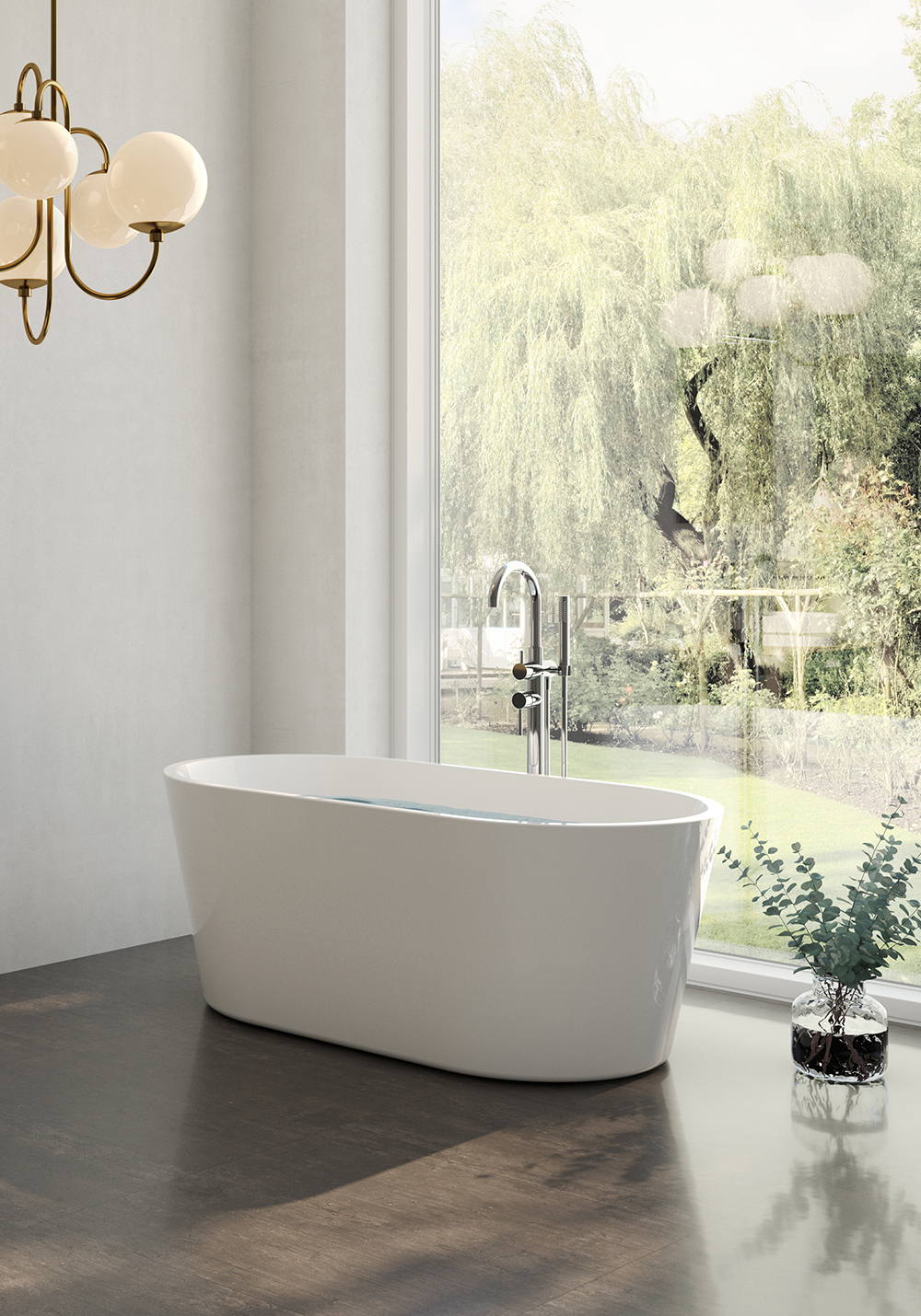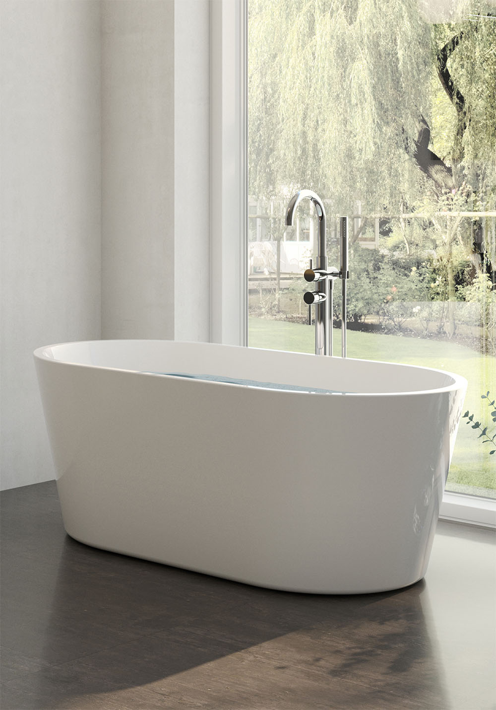 Et avrundet pent badekar med store innvendige mål. Badekaret er i sanitærakryl og leveres med forkrommet bunnventil, forkrommet avløpsrør og justerbare føtter.