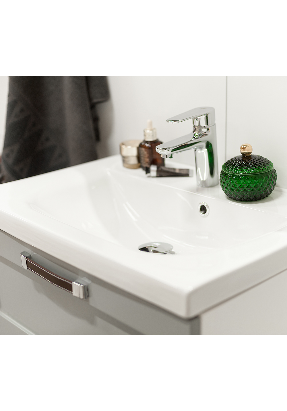 Håndtak i brunt kunstskinn. CC er dimensjonen mellom skruehullene.