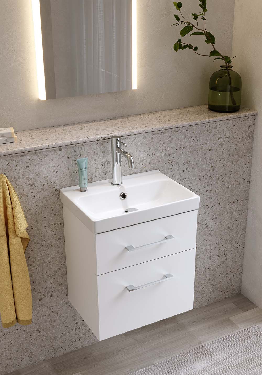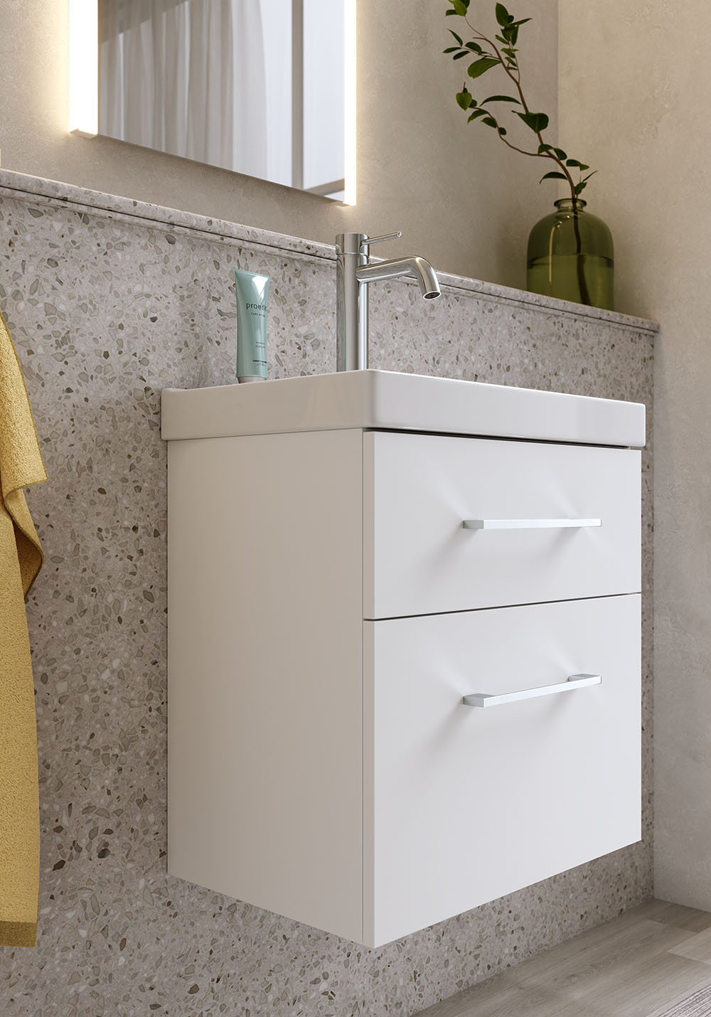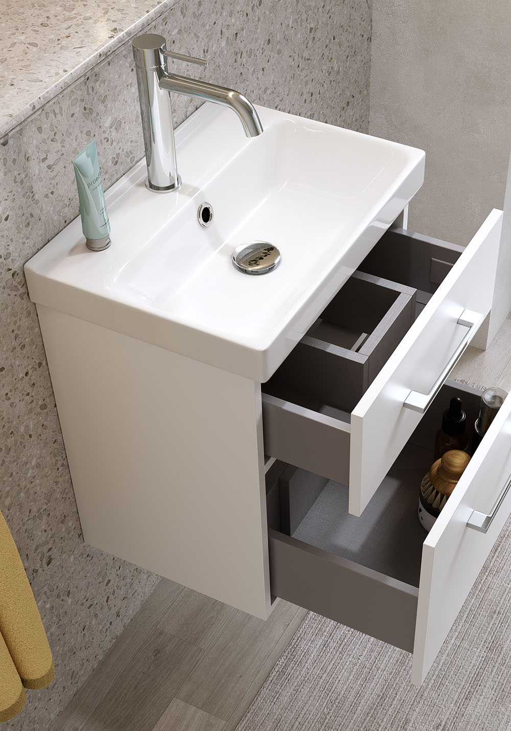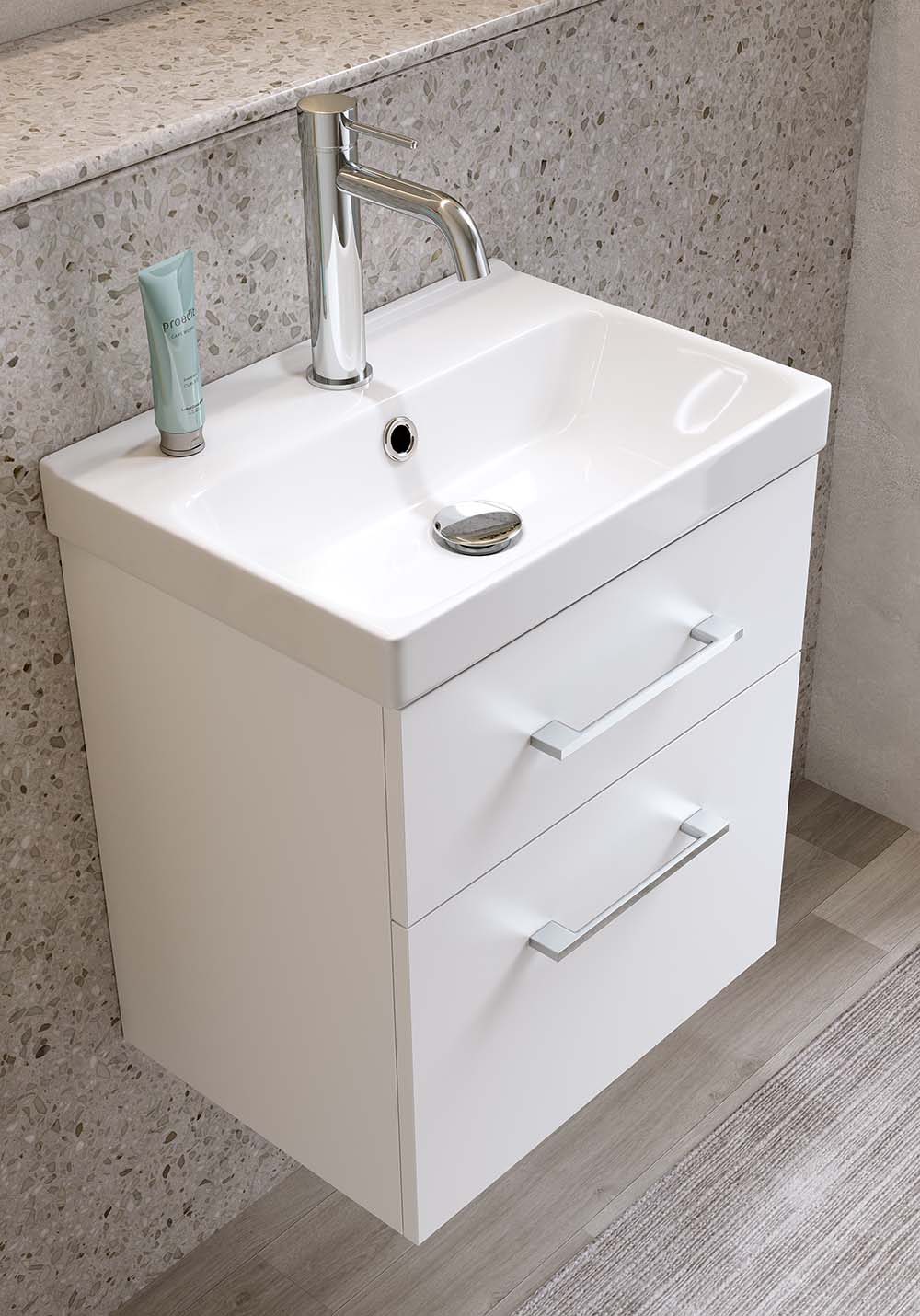 Fix Trend 420 er et moderne baderomsmøbel med porselensservant – perfekt for et lite baderom. Den grunne porselensservanten har en dybde på kun 320 mm og en praktisk avstillingsflate, mens overløpet gir ekstra trygghet i hverdagen.