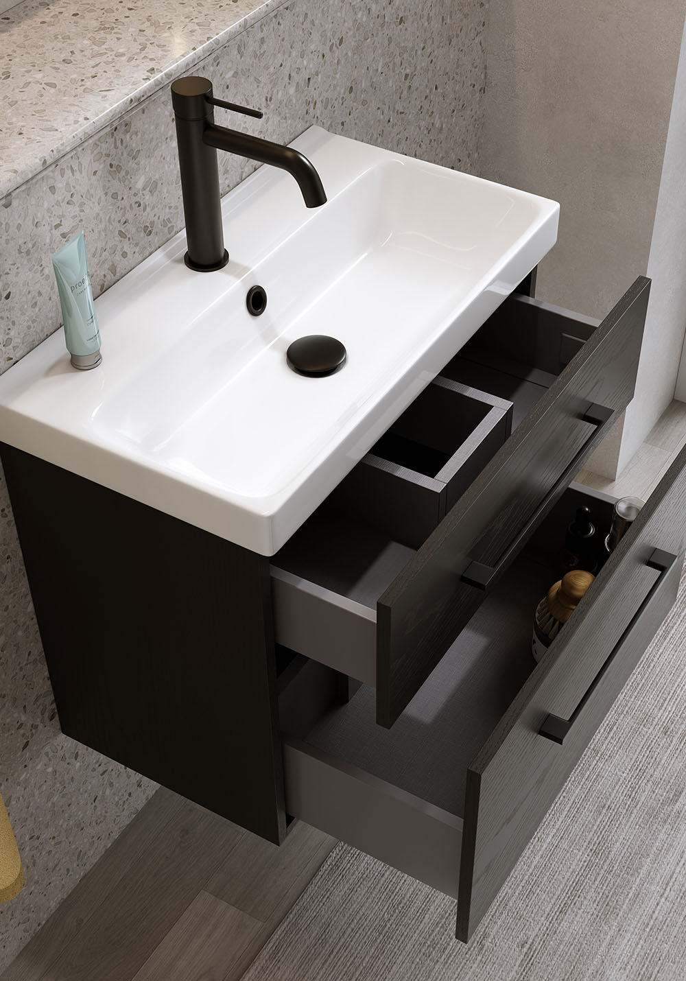 Fix Trend 550 er et moderne baderomsmøbel med porselensservant – perfekt for et lite baderom. Den grunne porselensservanten har en dybde på kun 320 mm og en praktisk avstillingsflate, mens overløpet gir ekstra trygghet i hverdagen.
