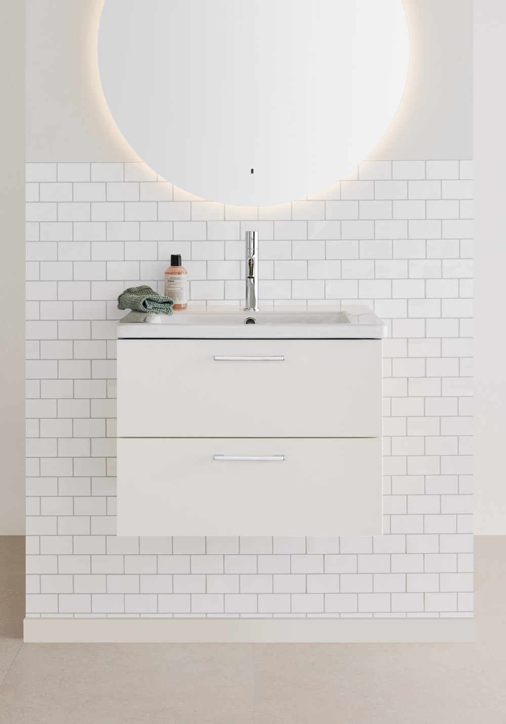 Neo 600 er en moderne kommode med servant. Servanten i porselen har brede avstillingsflater, en romslig avrundet kum som strekker seg helt ut til forkanten og overløp for ekstra trygghet. Dette baderomsskapet i bredde 60 cm har to skuffer med fullt uttrekk og Soft Close-funksjon. Skuffene gir god oppbevaring for håndklær og baderomsartikler, og leveres med to matchende innsatsbokser. Neo leveres med medfølgende håndtak. Skapet er ferdig montert og har justerbare opphengsbeslag som gjør monteringen enklere. Kommoden er forberedt for både gulv- og veggavløp.