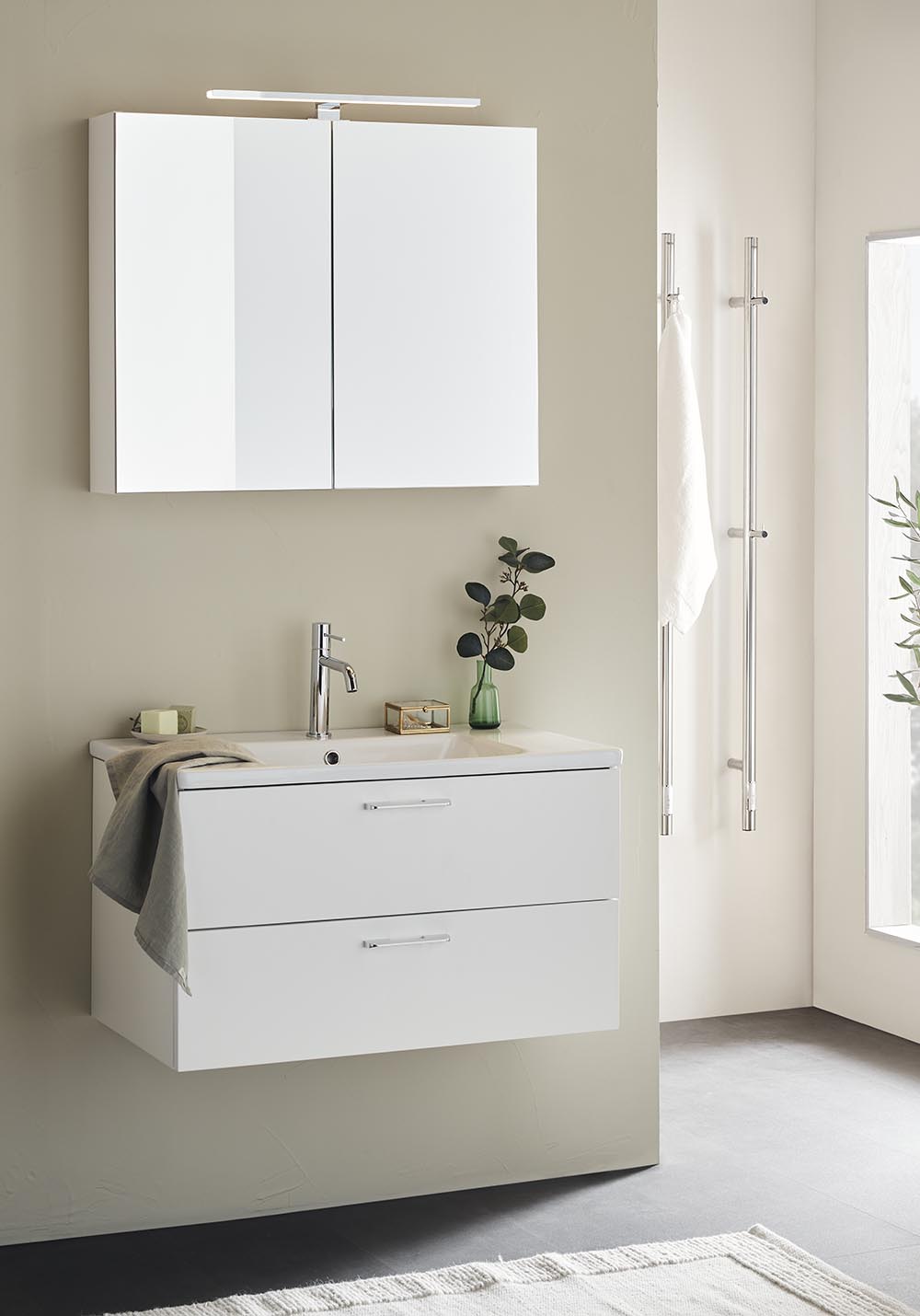 Neo 800 er en moderne kommode med servant. Servanten i porselen har brede avstillingsflater, en romslig avrundet kum som strekker seg helt ut til forkanten og overløp for ekstra trygghet.