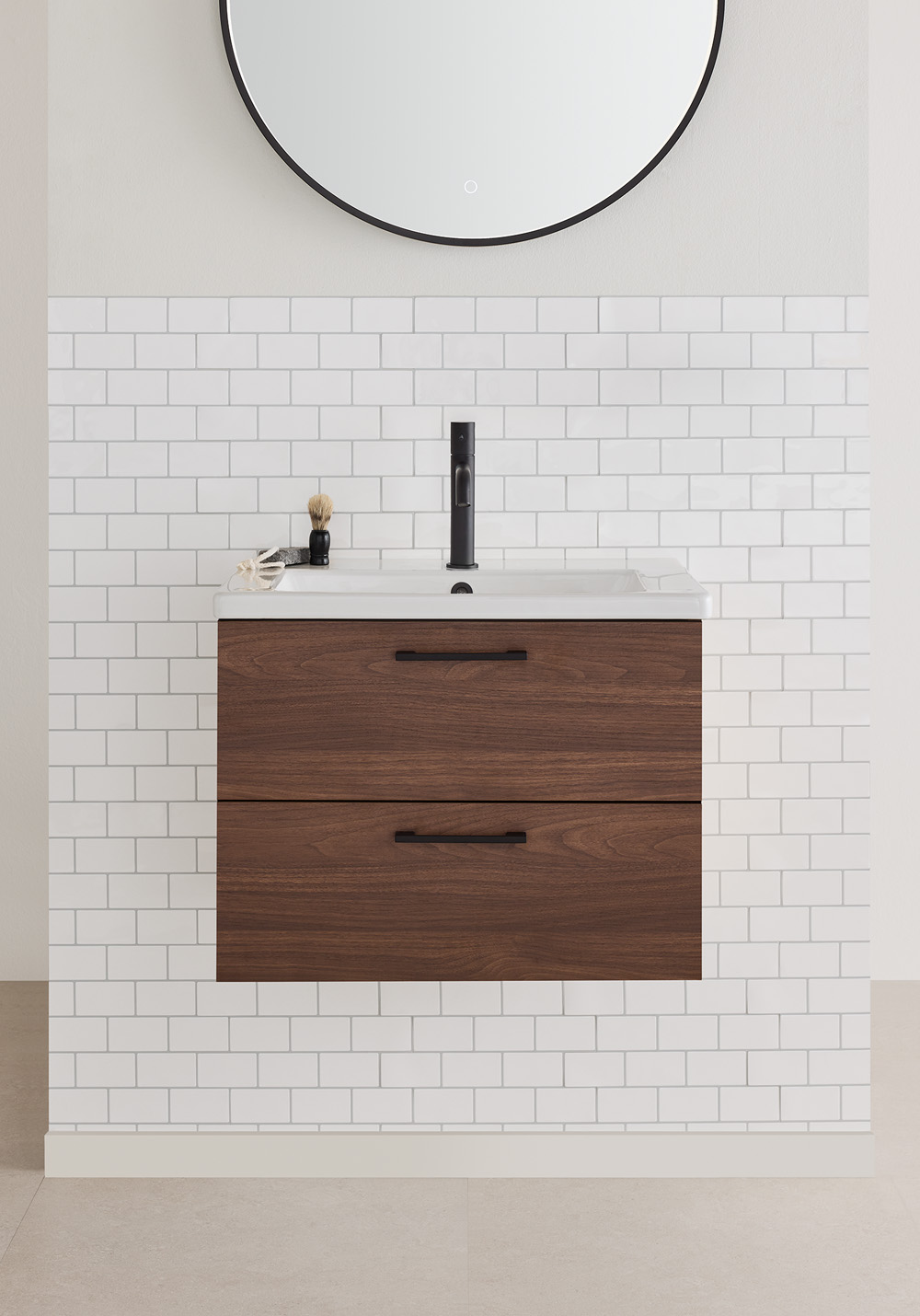 Neo 600 er en moderne kommode med servant. Servanten i porselen har brede avstillingsflater, en romslig avrundet kum som strekker seg helt ut til forkanten og overløp for ekstra trygghet. Dette baderomsskapet i bredde 60 cm har to skuffer med fullt uttrekk og Soft Close-funksjon. Skuffene gir god oppbevaring for håndklær og baderomsartikler, og leveres med to matchende innsatsbokser. Neo leveres med medfølgende håndtak. Skapet er ferdig montert og har justerbare opphengsbeslag som gjør monteringen enklere. Kommoden er forberedt for både gulv- og veggavløp.