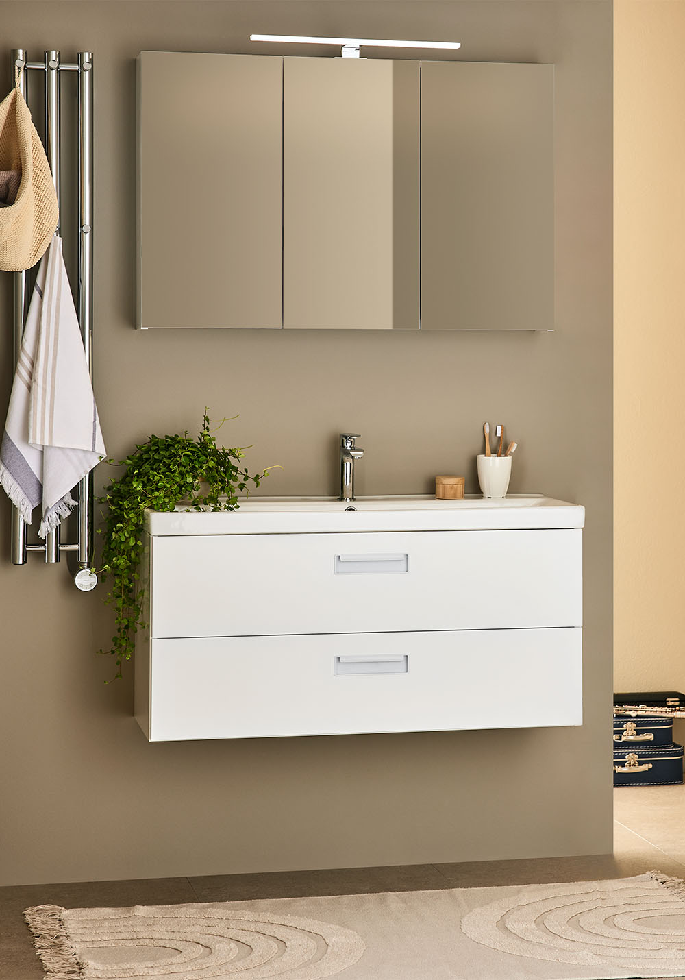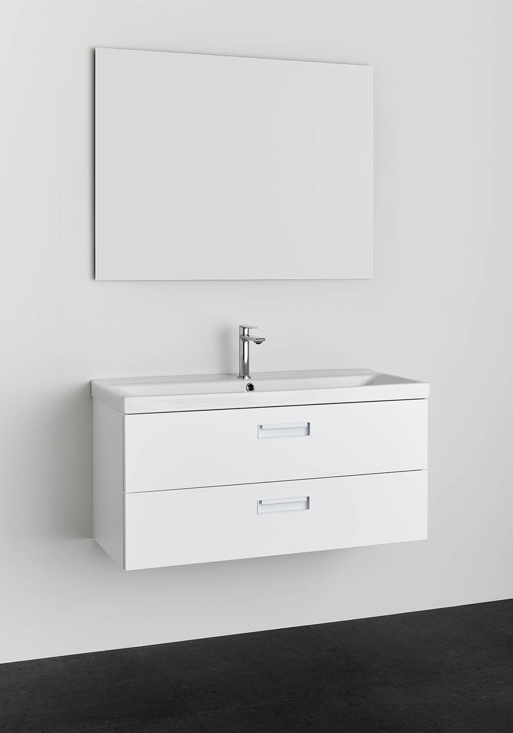 Noro Relounge baderomsskap med porselensservant i trendy design gir deg muligheten til å skape ditt personlige bad med sine unike mål og integrerte håndtak. Relounge er et designet baderomsmøbel som gir et luksuriøst preg og passer også til et smalt baderom. Finnes med hvit matt finish og svart trestruktur, og i flere bredder, og det er stor sjanse for at du finner noe som passer akkurat ditt baderom. Den nedsenkede servanten i porselen har en romslig og mykt formet skål, samt overløpsbeskyttelse. Leveres montert, klargjort for både vegg- og gulvavløp. Enkel installasjon med justerbare opphengsbeslag. Kjøp til bunnventil, avløpssett, stikkontakt og blandebatteri.