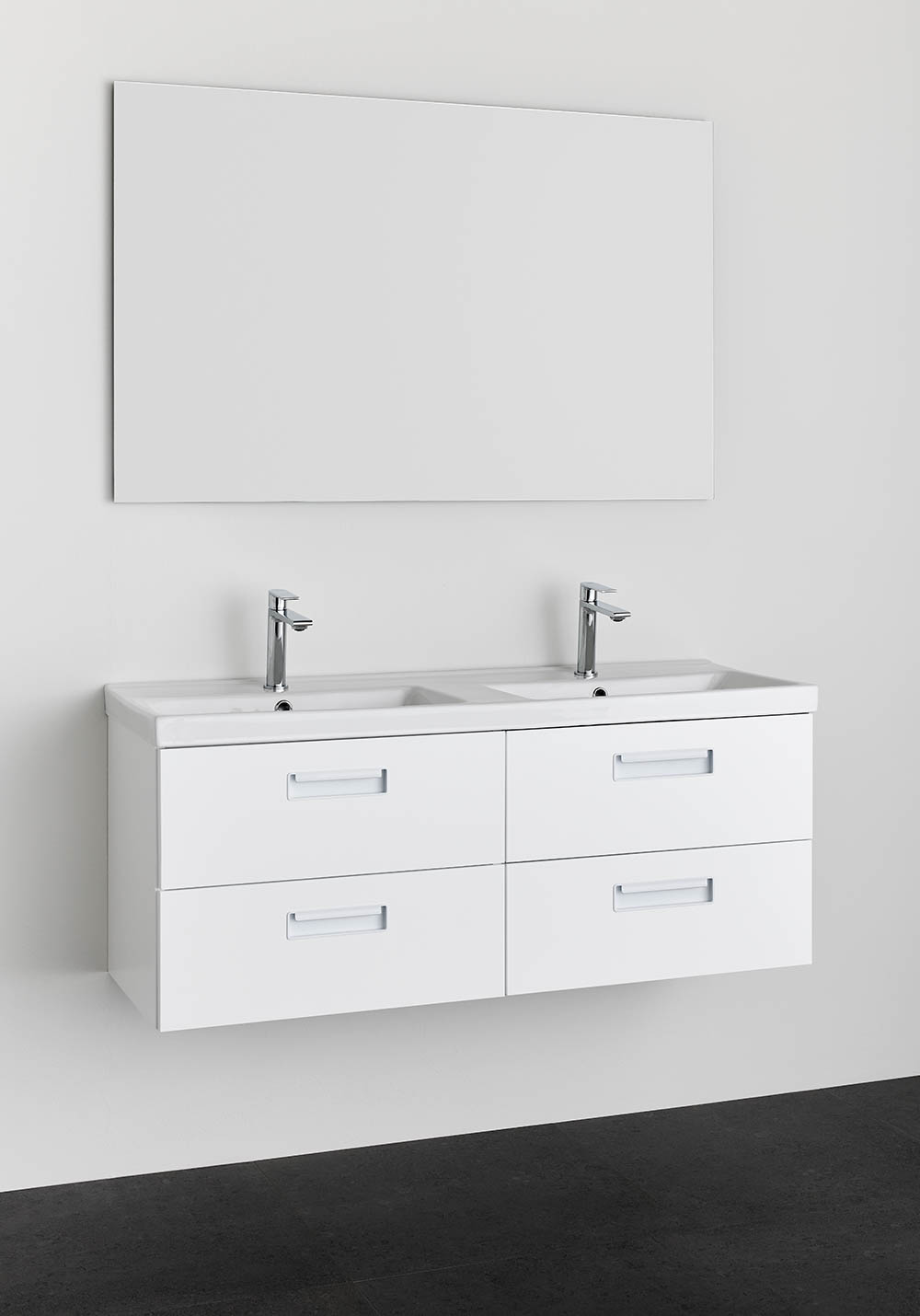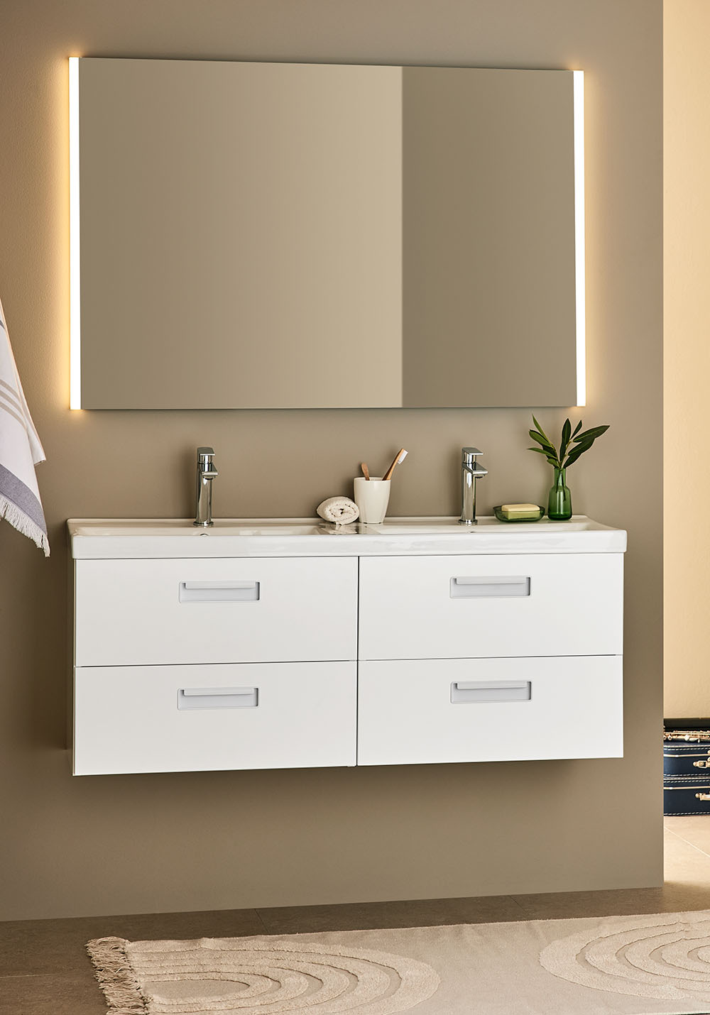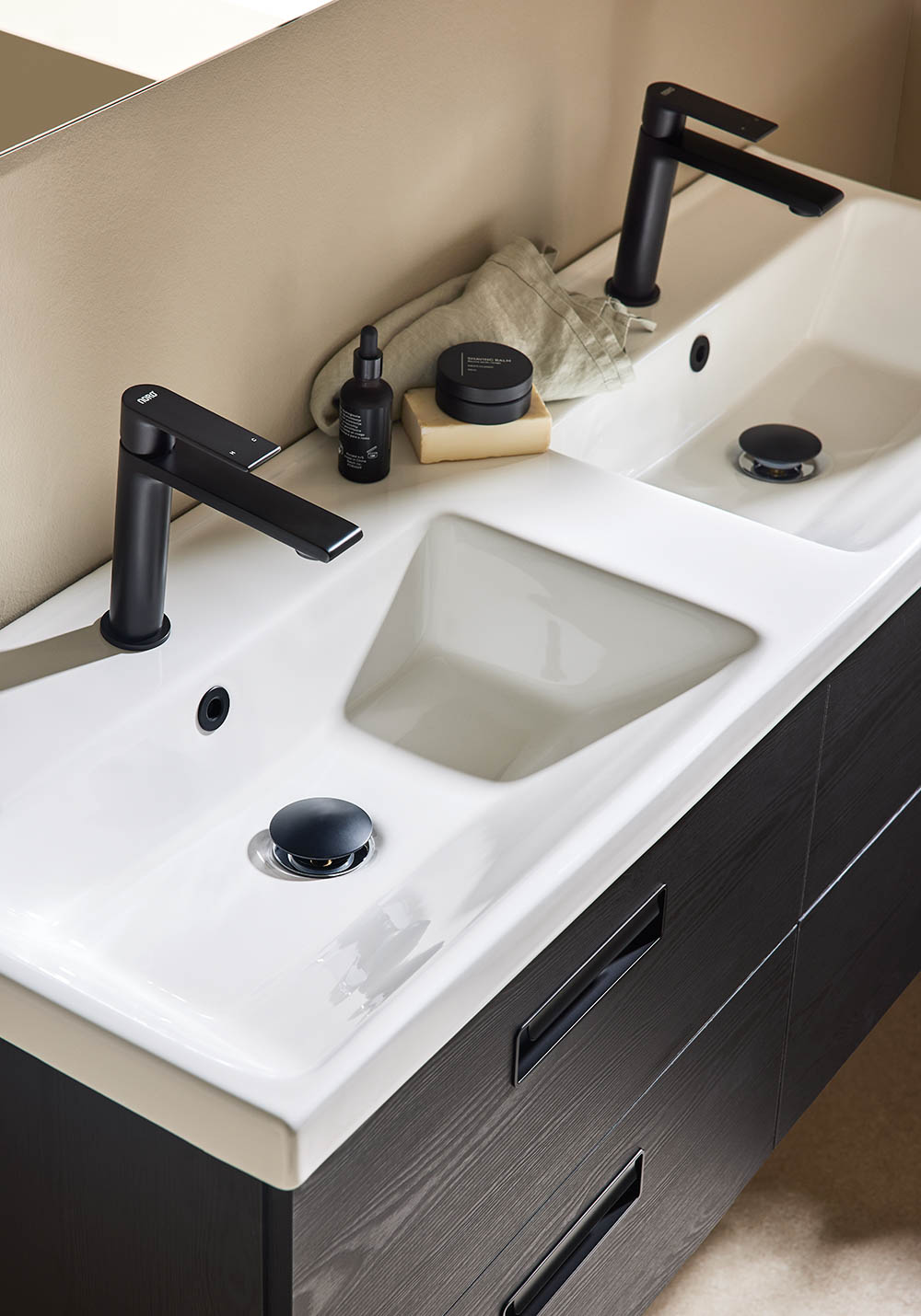 Noro Relounge baderomsskap med porselensservant i trendy design gir deg muligheten til å skape ditt personlige bad med sine unike mål og integrerte håndtak. Relounge er et designet baderomsmøbel som gir et luksuriøst preg og passer også til et smalt baderom. Finnes med hvit matt finish og svart trestruktur, og i flere bredder, og det er stor sjanse for at du finner noe som passer akkurat ditt baderom. Den nedsenkede servanten i porselen har en romslig og mykt formet skål, samt overløpsbeskyttelse. Leveres montert, klargjort for både vegg- og gulvavløp. Enkel installasjon med justerbare opphengsbeslag. Kjøp til bunnventil, avløpssett, stikkontakt og blandebatteri.