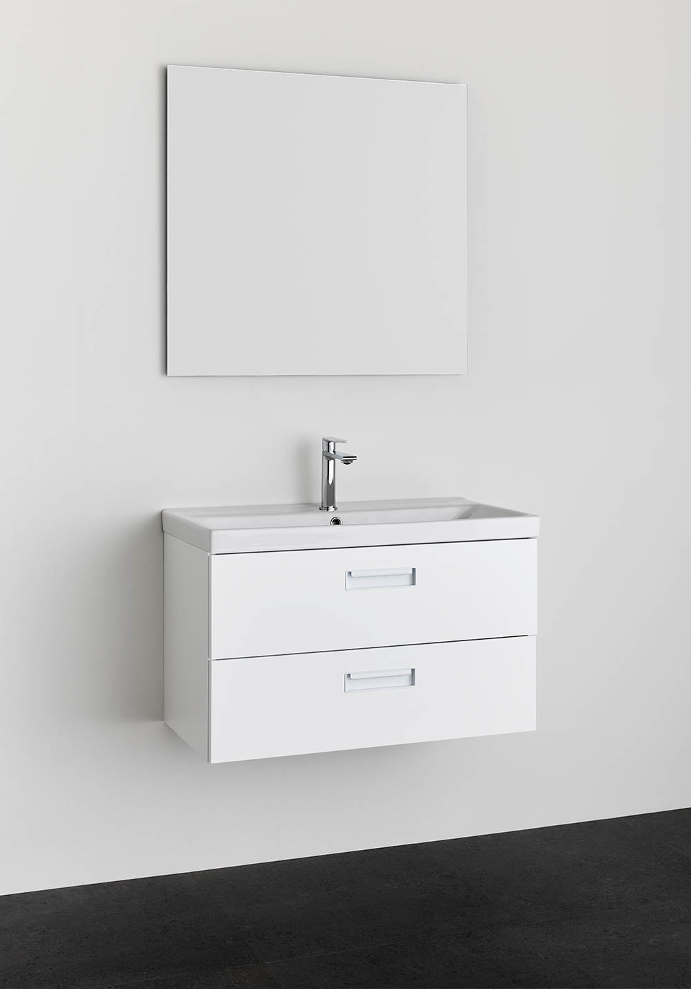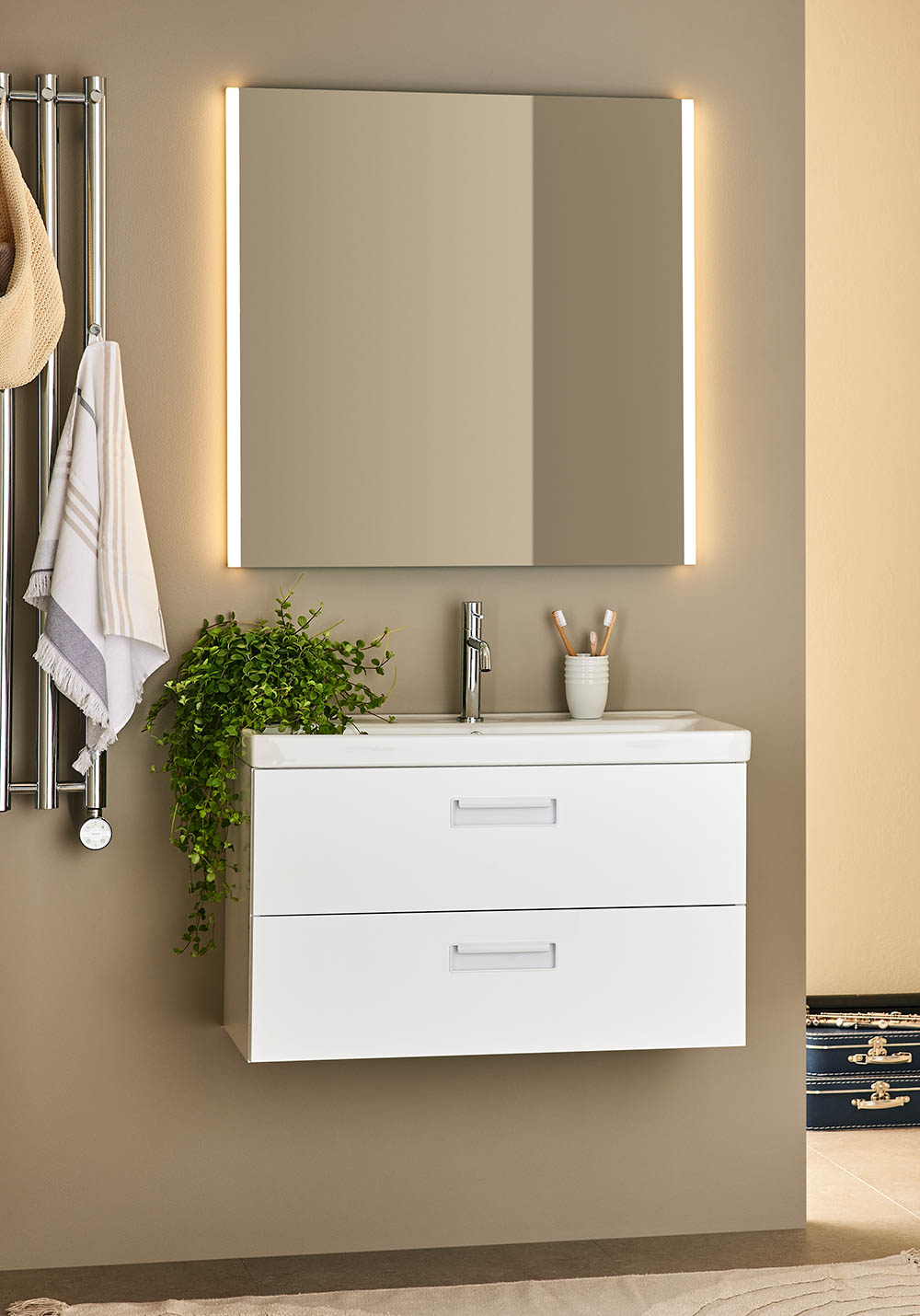 Noro Relounge baderomsskap med porselensservant i trendy design gir deg muligheten til å skape ditt personlige bad med sine unike mål og integrerte håndtak. Relounge er et designet baderomsmøbel som gir et luksuriøst preg og passer også til et smalt baderom. Finnes med hvit matt finish og svart trestruktur, og i flere bredder, og det er stor sjanse for at du finner noe som passer akkurat ditt baderom. Den nedsenkede servanten i porselen har en romslig og mykt formet skål, samt overløpsbeskyttelse. Leveres montert, klargjort for både vegg- og gulvavløp. Enkel installasjon med justerbare opphengsbeslag. Kjøp til bunnventil, avløpssett, stikkontakt og blandebatteri.
