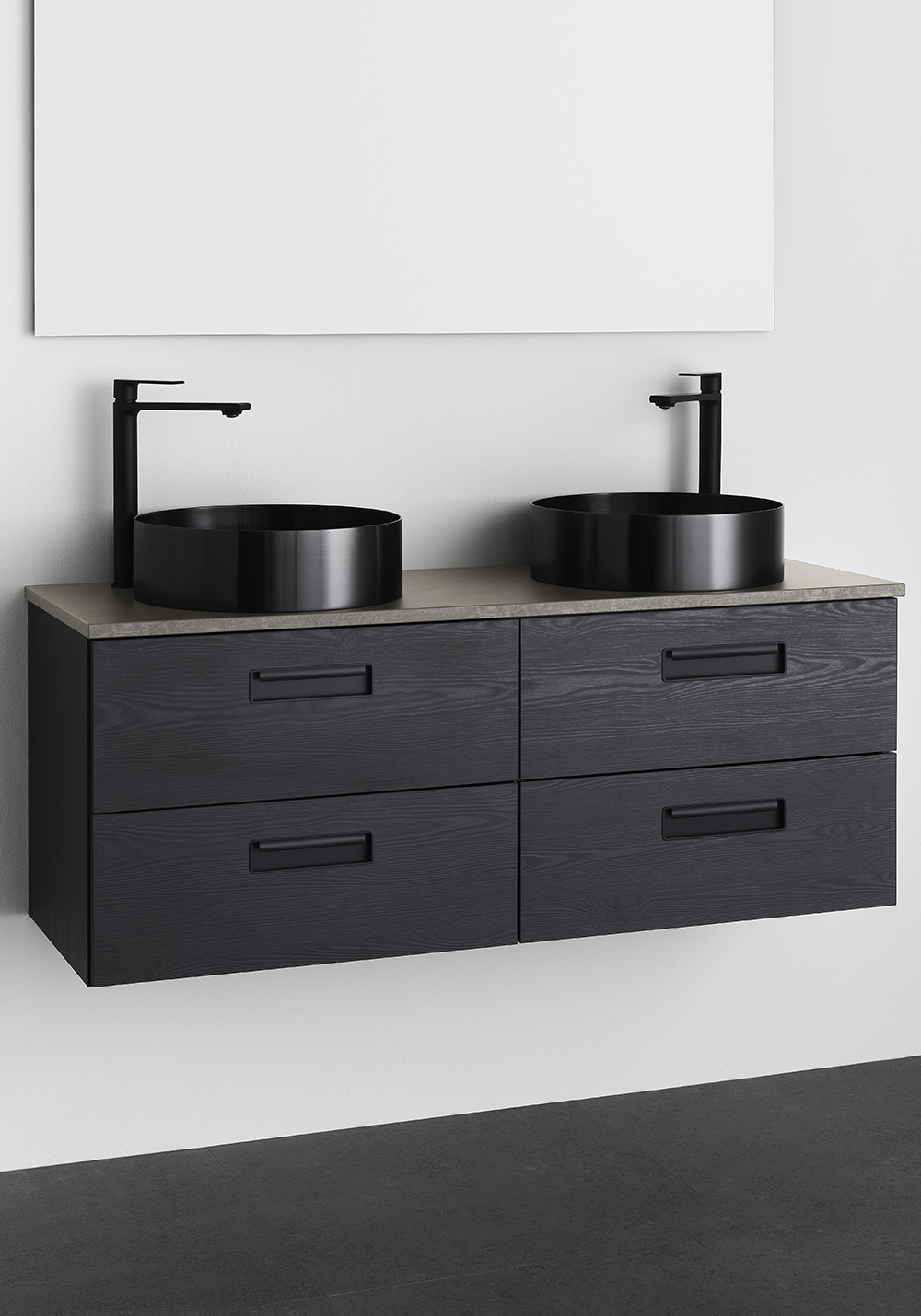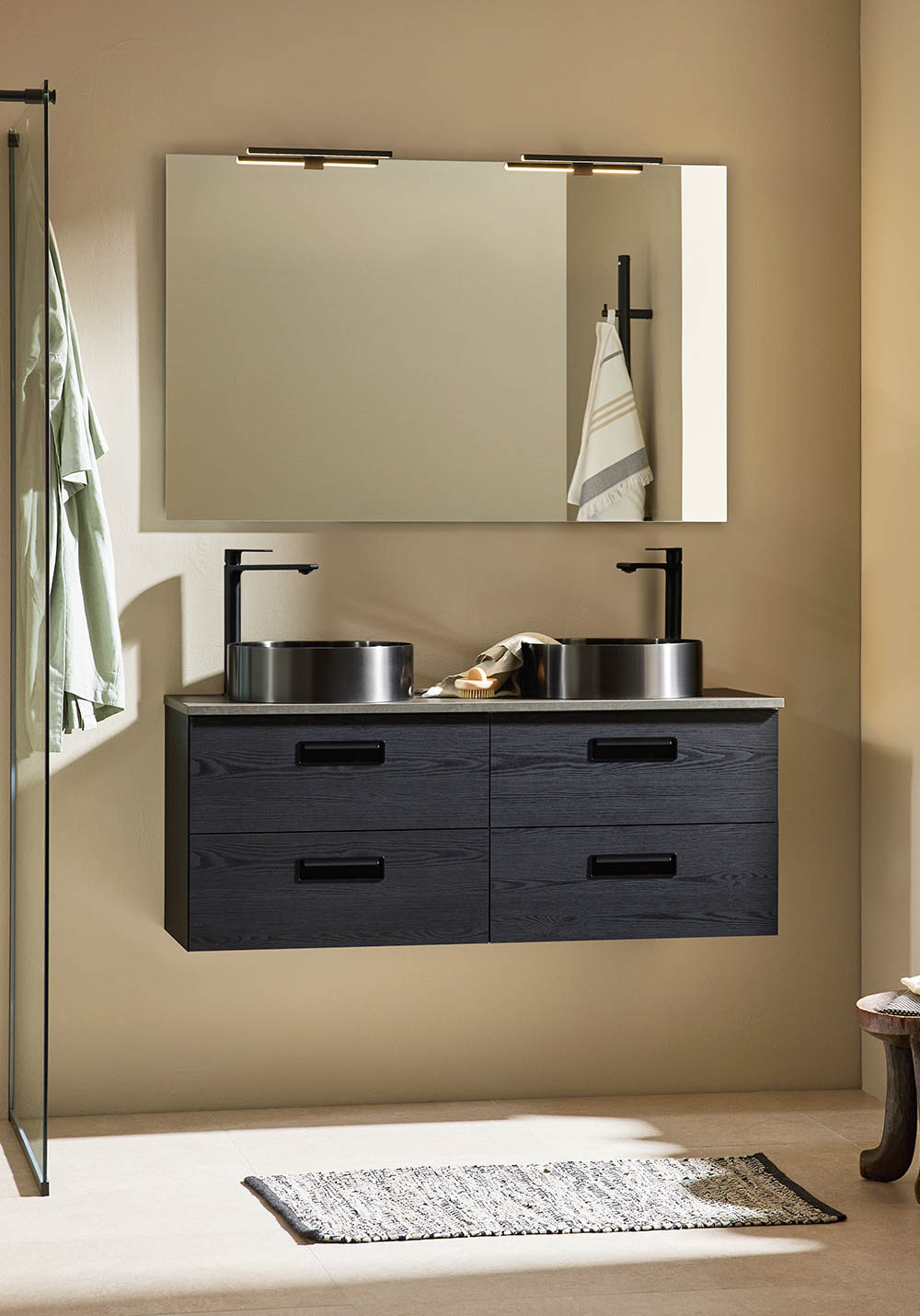 Noro Relounge baderomsskap med benkeplate i trendy design gir deg muligheten til å skape ditt personlige bad med sine unike mål og integrerte håndtak. Relounge er et designet baderomsmøbel som gir et luksuriøst preg og passer også til et smalt baderom. Finnes med hvit matt finish og svart trestruktur, og i flere bredder, og det er stor sjanse for at du finner noe som passer akkurat ditt baderom. Benkeplate av MDF med slitesterk overflate av melamin. Valg til en elegant frittstående servant. Leveres montert, klargjort for både vegg- og gulvavløp. Enkel installasjon med justerbare opphengsbeslag. Kjøp til bunnventil, avløpssett, stikkontakt og blandebatteri.