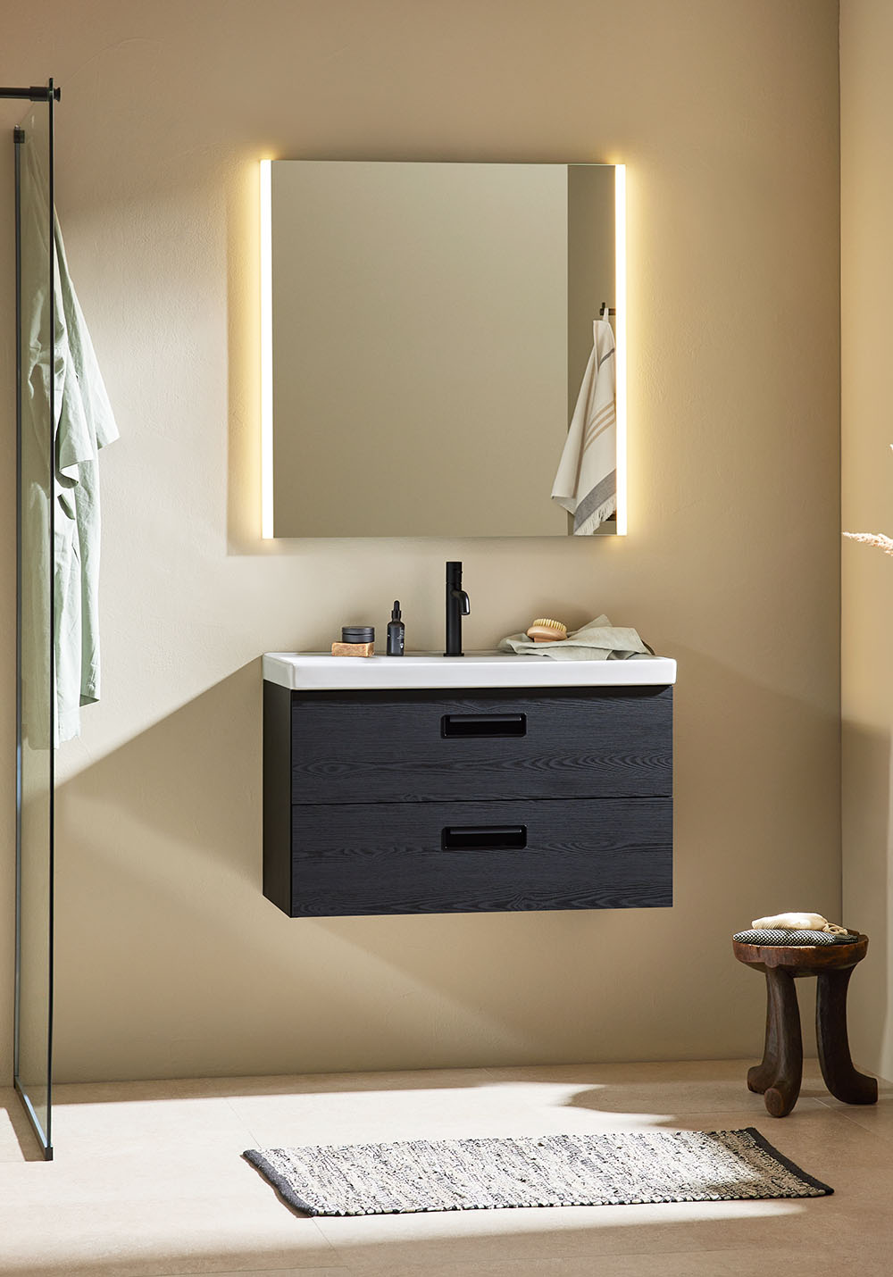 Noro Relounge baderomsskap med porselensservant i trendy design gir deg muligheten til å skape ditt personlige bad med sine unike mål og integrerte håndtak. Relounge er et designet baderomsmøbel som gir et luksuriøst preg og passer også til et smalt baderom. Finnes med hvit matt finish og svart trestruktur, og i flere bredder, og det er stor sjanse for at du finner noe som passer akkurat ditt baderom. Den nedsenkede servanten i porselen har en romslig og mykt formet skål, samt overløpsbeskyttelse. Leveres montert, klargjort for både vegg- og gulvavløp. Enkel installasjon med justerbare opphengsbeslag. Kjøp til bunnventil, avløpssett, stikkontakt og blandebatteri.