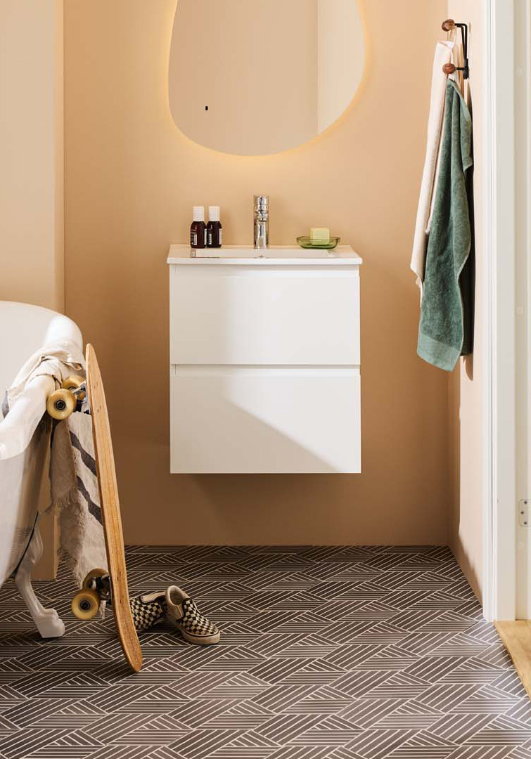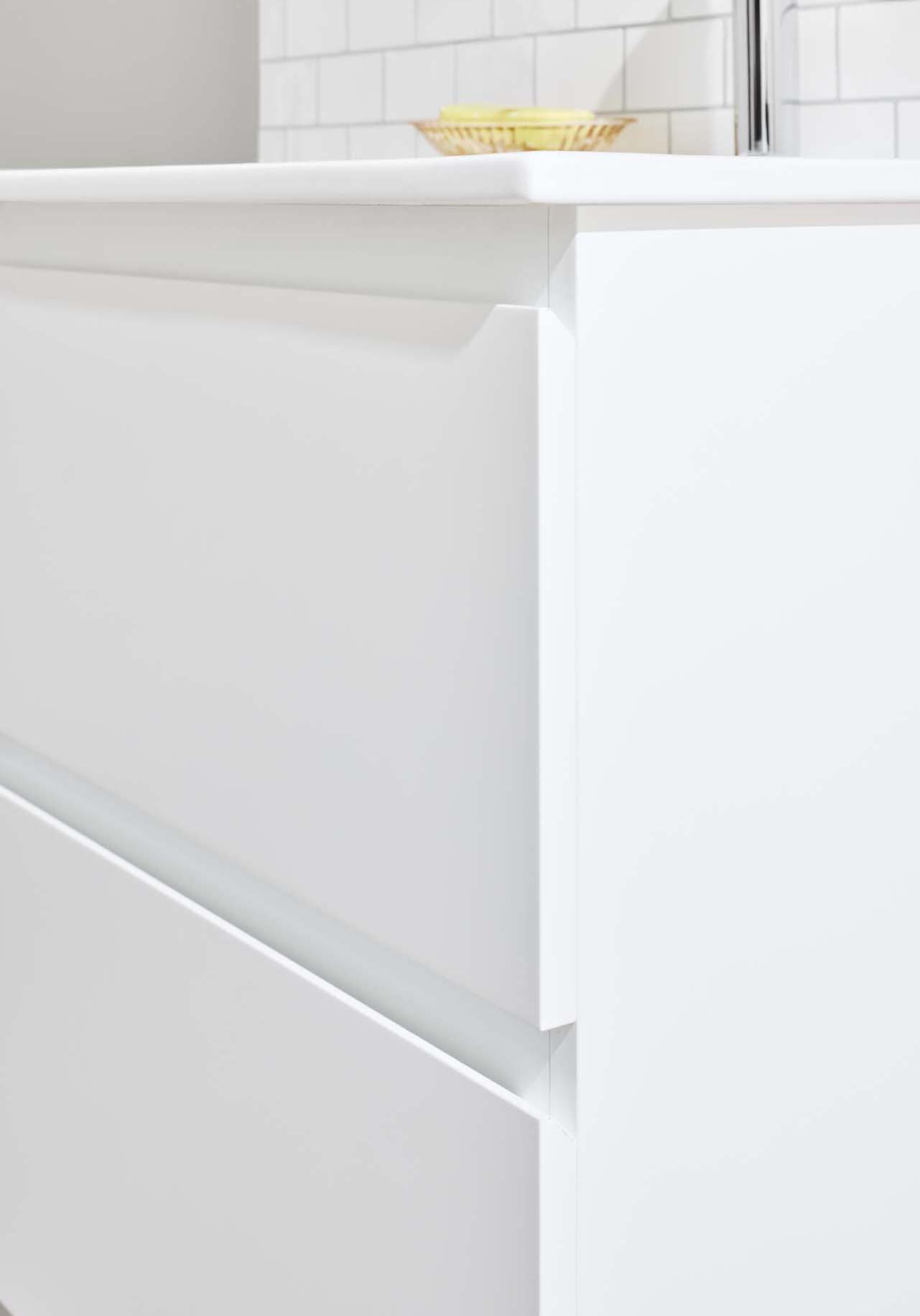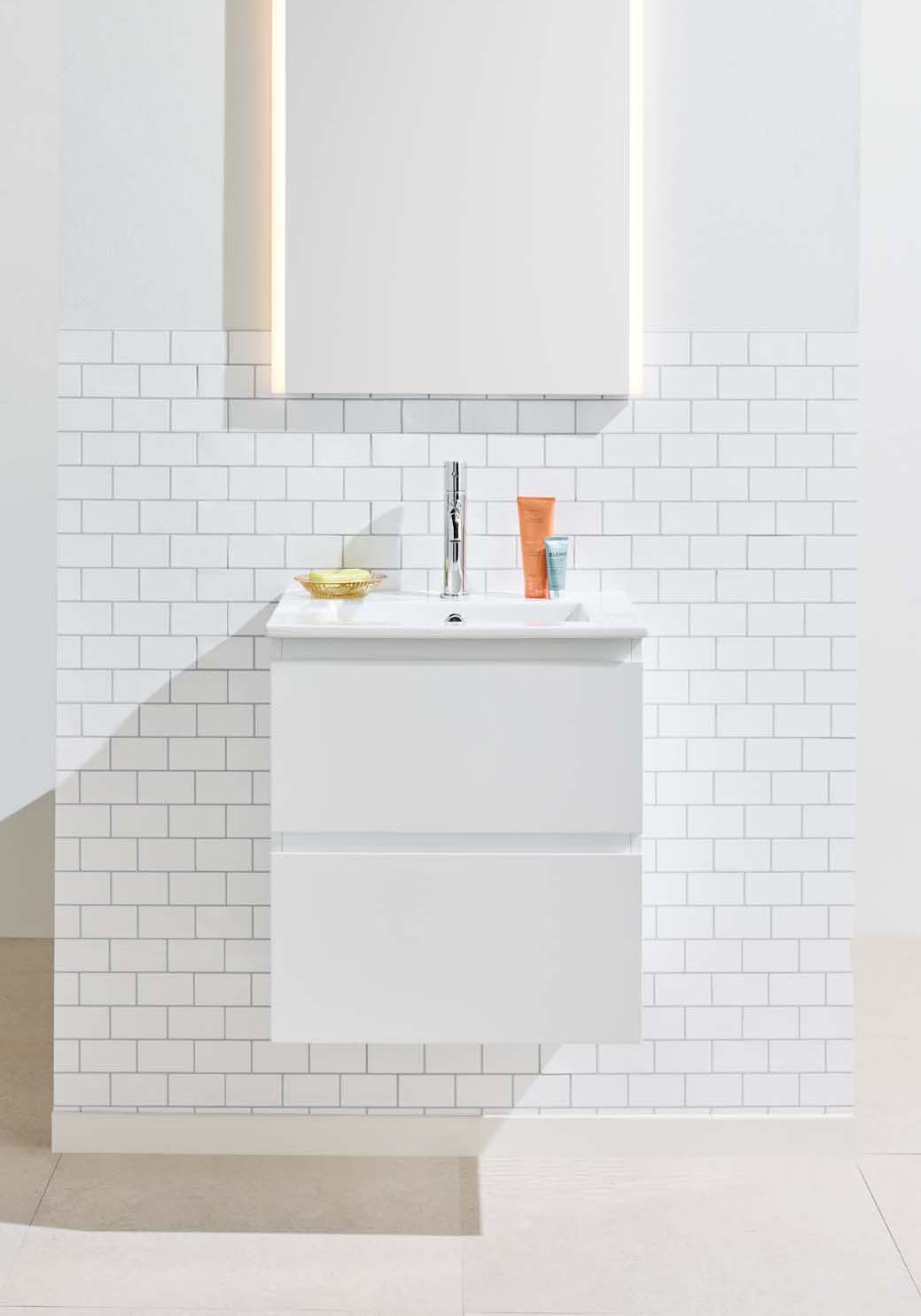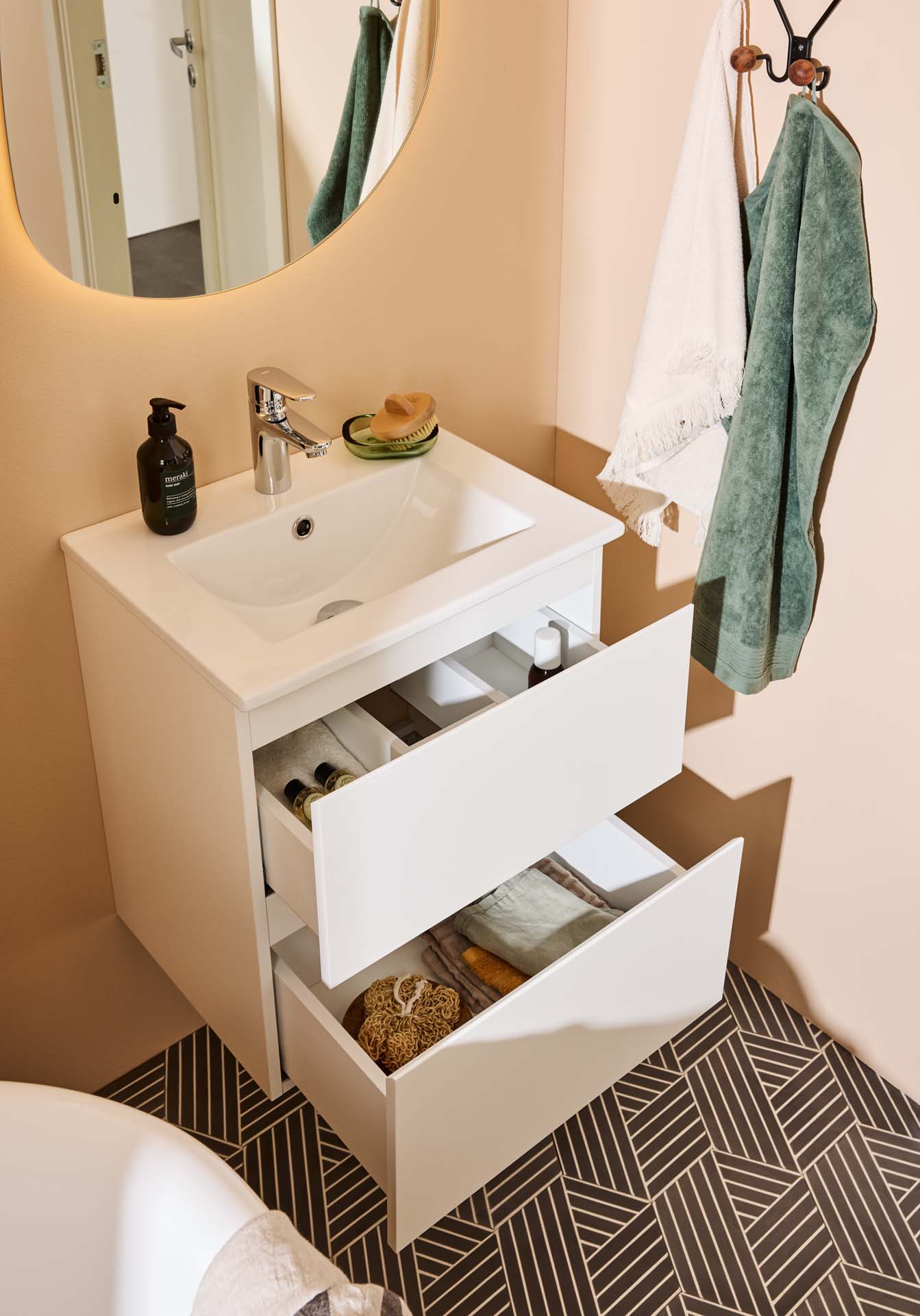 Noro Vega servantskap er et moderne møbel i en praktisk, litt mindre størrelse og med servant i porselen. De to skuffene med Soft Close gir rikelig med oppbevaringsplass på et lite bad og har integrerte håndtak. Baderomsskapet har en slitesterk lakkert overflate og er også forberedt for vegg- og gulvavløp. Kjøp servantbatteri, bunnventil og avløpssett.