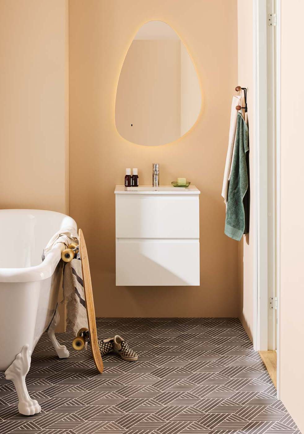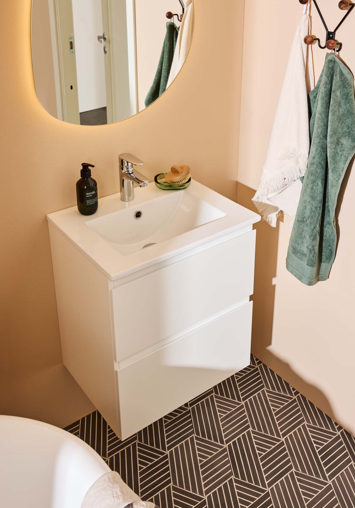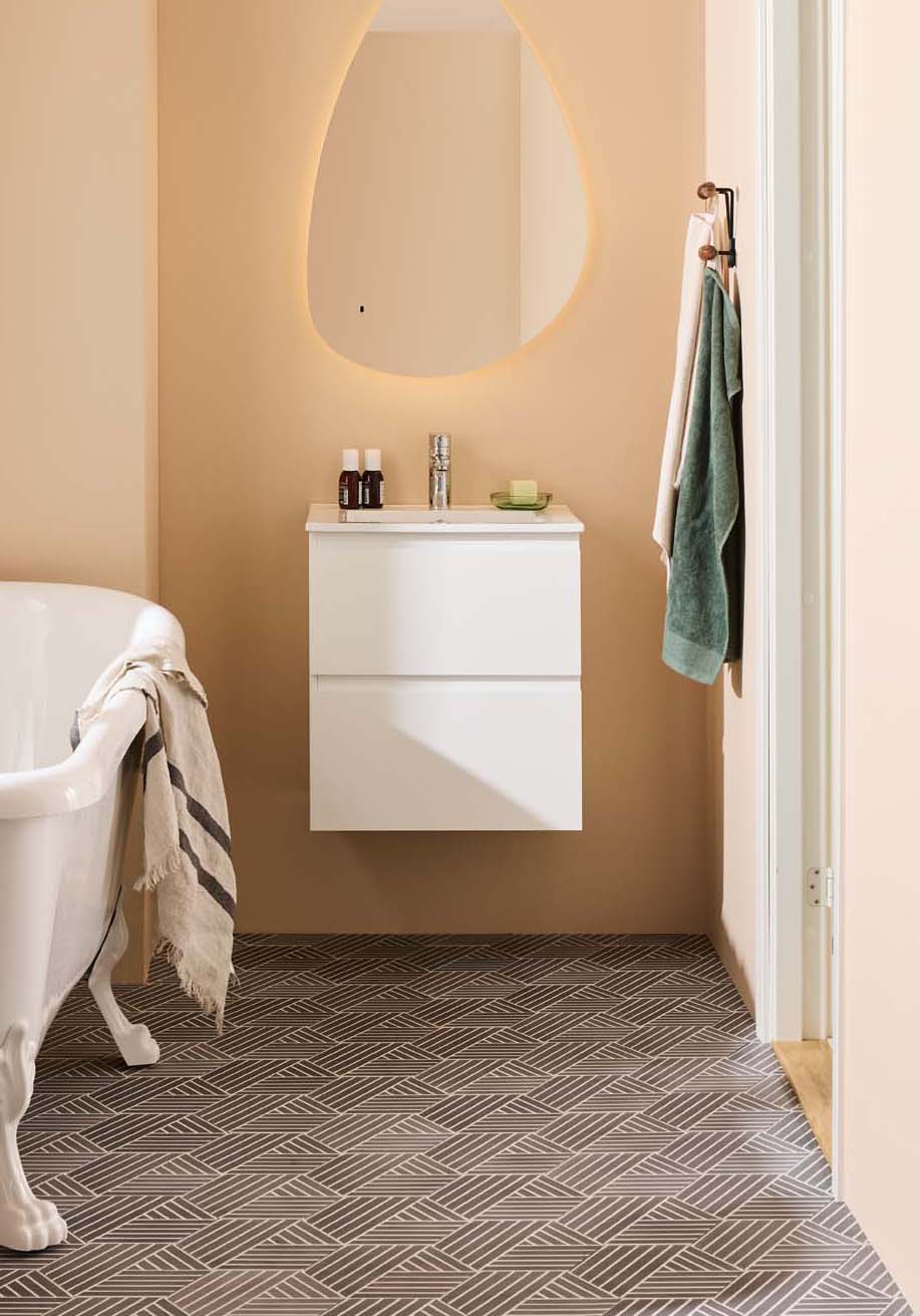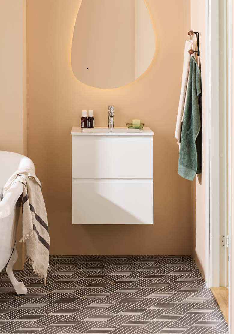 Noro Vega servantskap er et moderne møbel i en praktisk, litt mindre størrelse og med servant i porselen. De to skuffene med Soft Close gir rikelig med oppbevaringsplass på et lite bad og har integrerte håndtak. Baderomsskapet har en slitesterk lakkert overflate og er også forberedt for vegg- og gulvavløp. Kjøp servantbatteri, bunnventil og avløpssett.