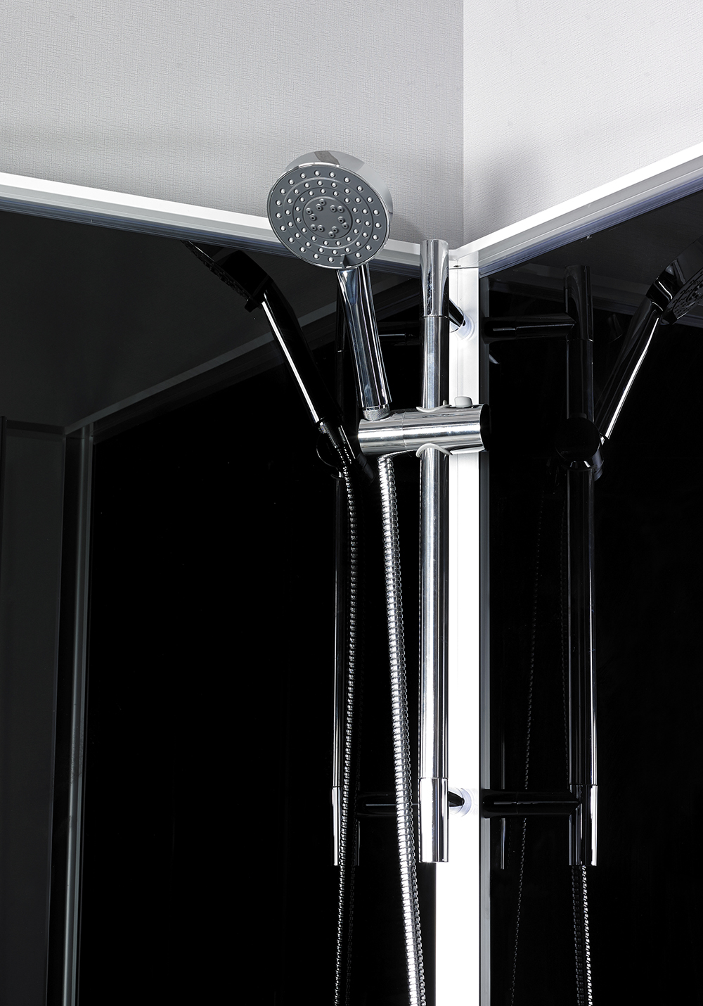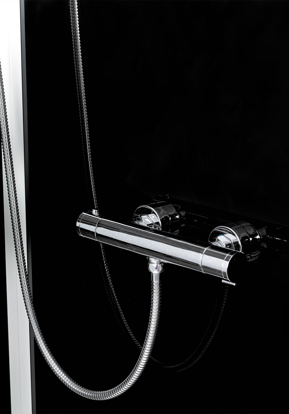Sølvmatt finish/overflate. 5mm herdet sikkerhetsglass. Bakvegger i svart eller hvitt sikkerhetsglass. Kar i sanitærakryl med avtagbar front. Håndtak i rustfritt stål. 3-funksjons dusjsett. Magnetfunksjon i dører for sikker og god lukking. Tilpasset dusjblander cc 150 og 160mm. Sveiset rustfritt stativ. Håndtak inngår.