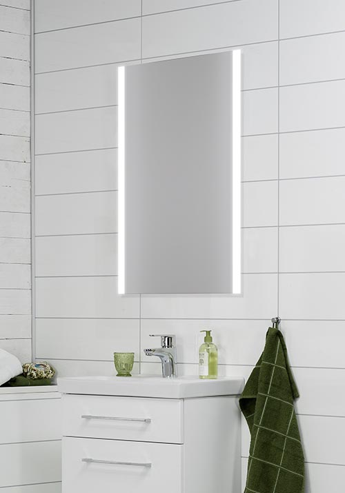 Stilrent speil med LED-belysning på sidene som lyser utover og rett frem, noe som gir godt lys ved f.eks. sminking og barbering. Varmhvitt lys på 3000K. IP44.