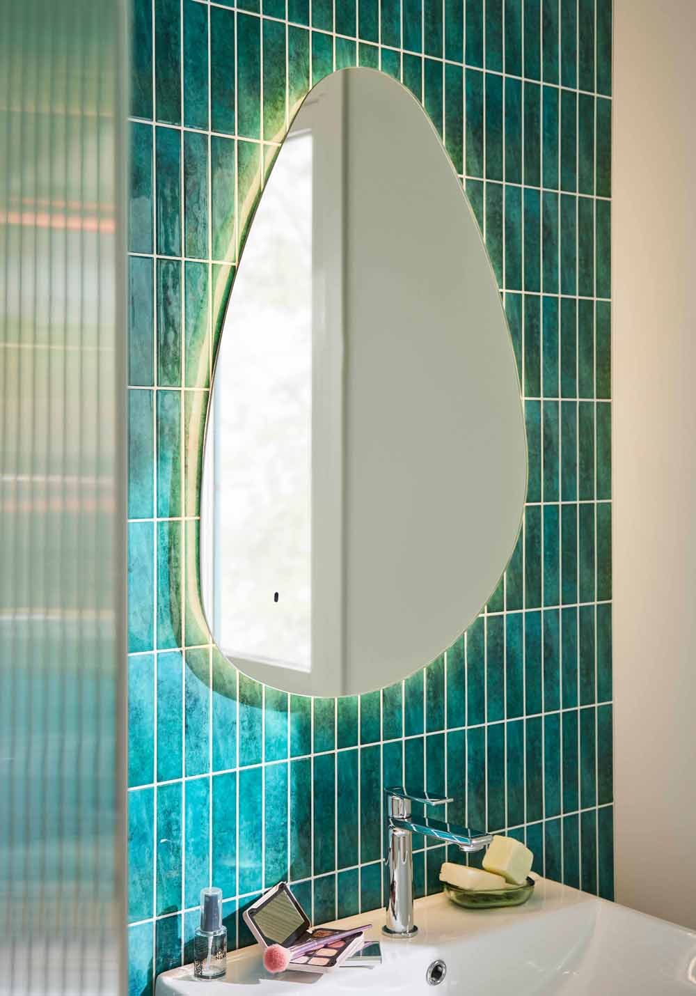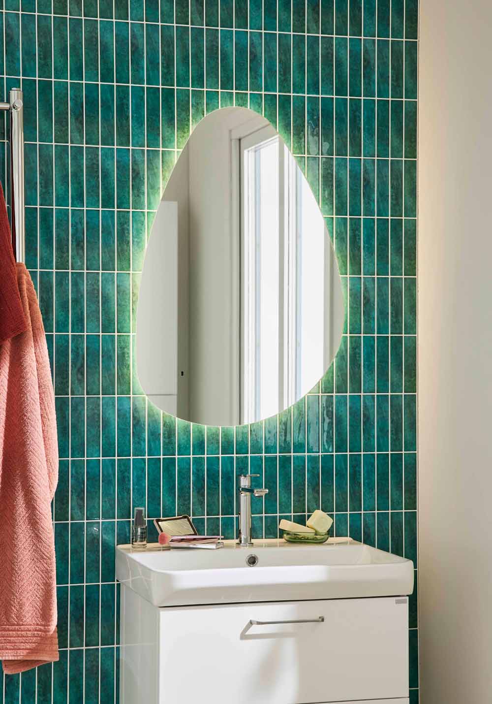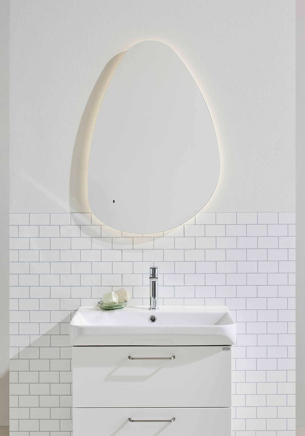 Baderomsspeilet Glow har avrundede former og bakgrunnsbelysning hele veien rundt for å gi en stemningsfull belysning på badet. Lysstyrken kan dimmes, og lyset slås av og på via bevegelsessensor (IR) for å unngå fingeravtrykk på speilet. Speilet har en minnefunksjon som husker det siste lysstyrkenivået når det slås av og på. Varmhvitt lys 3000K, IP44.