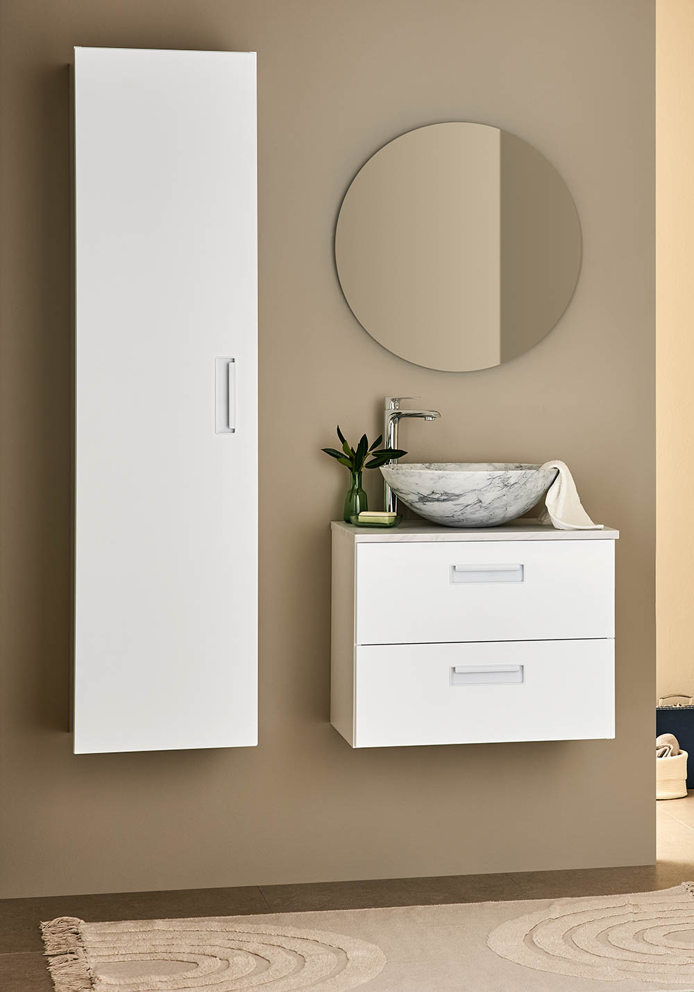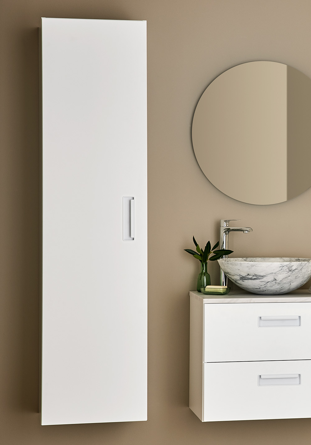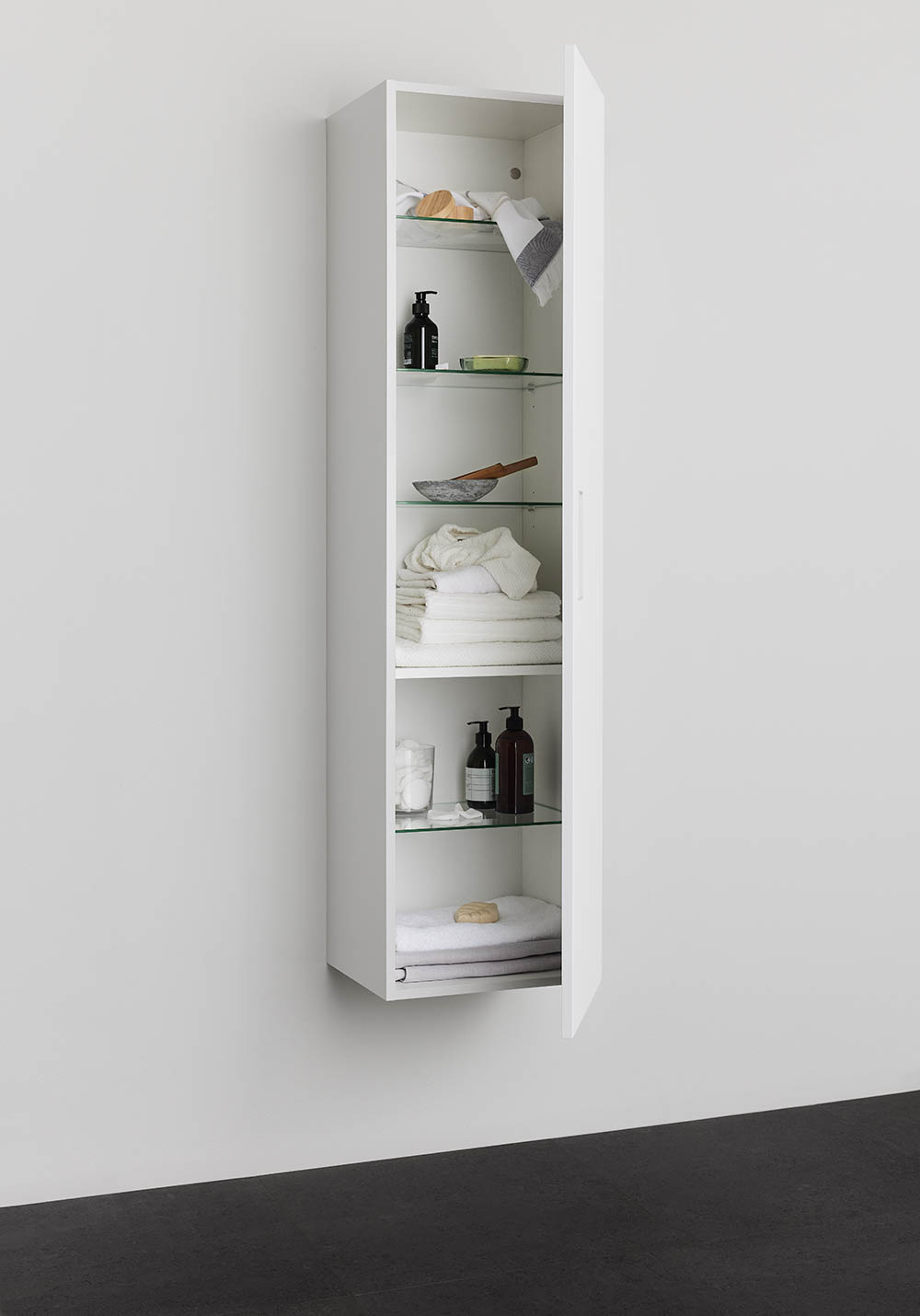 Noro Relounge høyskap med trendy design, gir deg muligheten til å skape ditt personlige baderom med integrerte håndtak. Høyskapet er romslig og tilpasset for å ha plass til håndklær og annet som trengs på et baderom. Finnes i svart tremønstret overflate og lakkert matt hvit. På innsiden er skapene hvite og har fire flyttbare glasshyller samt en fast hylle i midten. Leveres montert og du velger selv om døren skal henge på høyre eller venstre side ved montering. Kjøp til stikkontakt.